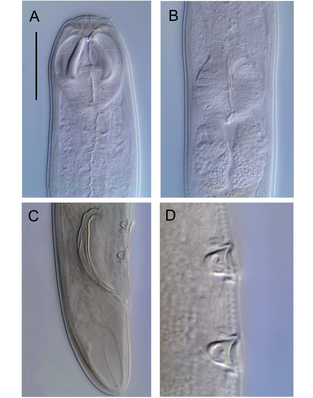 Fig. 7. Pseudocheironchus ingluviosus gen. et sp. nov. Light micrographs. A. Female head region showing buccal cavity and mandibles. B. Female posterior pharyngeal bulb and anterior portion of intestine. C. Male posterior body region showing right spicule and cup-shaped supplements. D. Detail of pre-cloacal supplements. Scale bar: A-C = 30 μm; D = 10 μm.