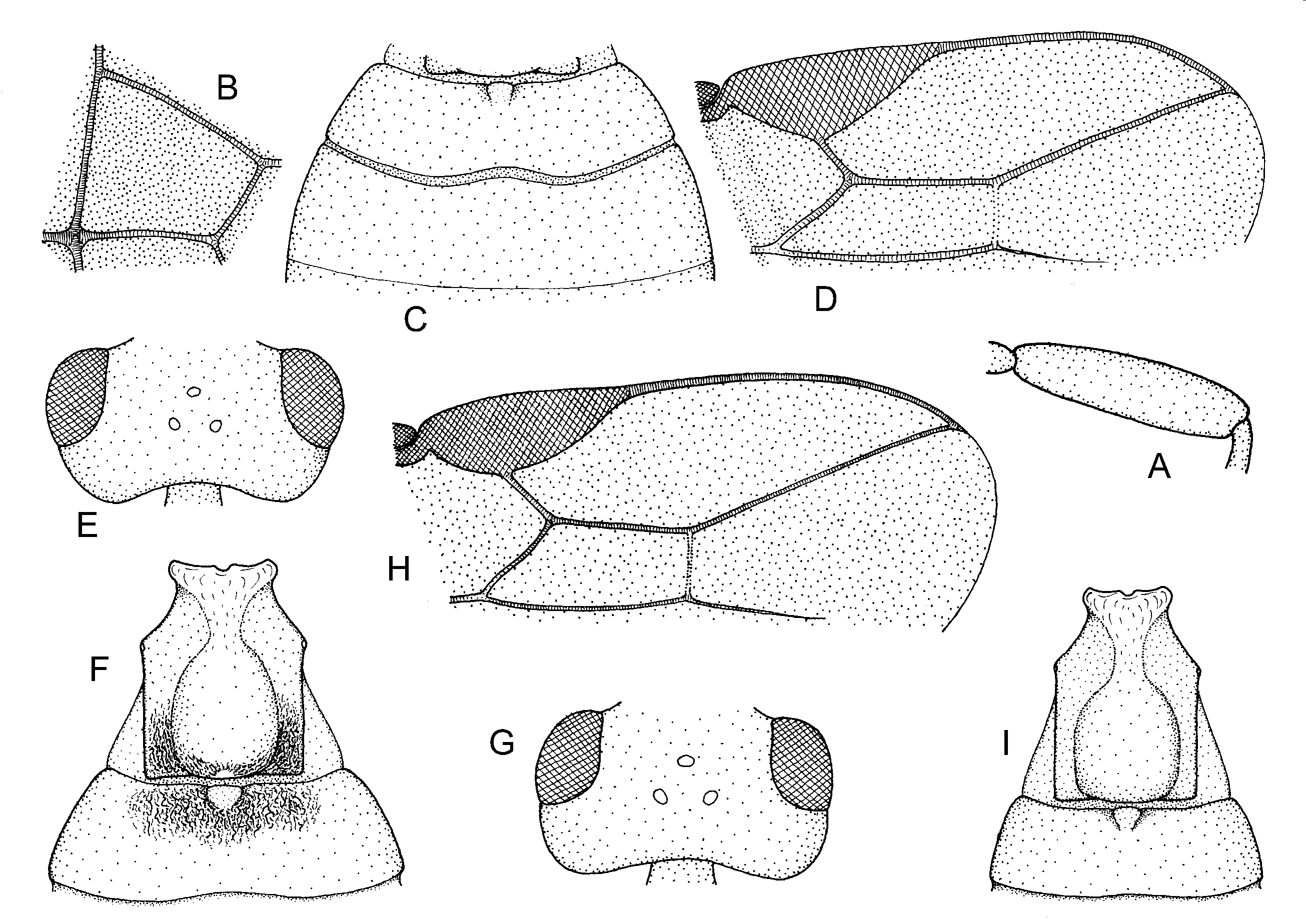 Fig. 2. — A-D. Bracon (Glabrobracon) colpophorus Wesmael, 1838. A. Hind femur of ♀ + ♁. B. First discal cell of forewing of ♀. C. Tergites 2-3 of ♀ + ♁. D. Distal part of right forewing of ♁. — E-F. Bracon (Glabrobracon) instabilis Marshall, 1885 ♀. E. Head in dorsal view. F. tergites 1-2. — G-I. Bracon (Glabrobracon) obscurator Nees, 1811, ♀. G. Head in dorsal view. H. Distal part of right forewing. I. Tergites 1-2.