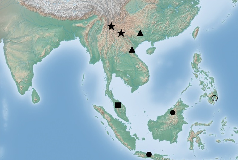 FIGURE 12. Distribution map of the examined specimens. Ceratopompa festiva Karsch and Zulpha spp. ■: C. festiva Karsch; ●: Z. perlaria (Westwood); ▲: Z. ruohua Wu, Zhang & Liu sp. nov.; ★: Z. fenghuang Wu & Liu sp. nov.; ○: Zulpha sp..