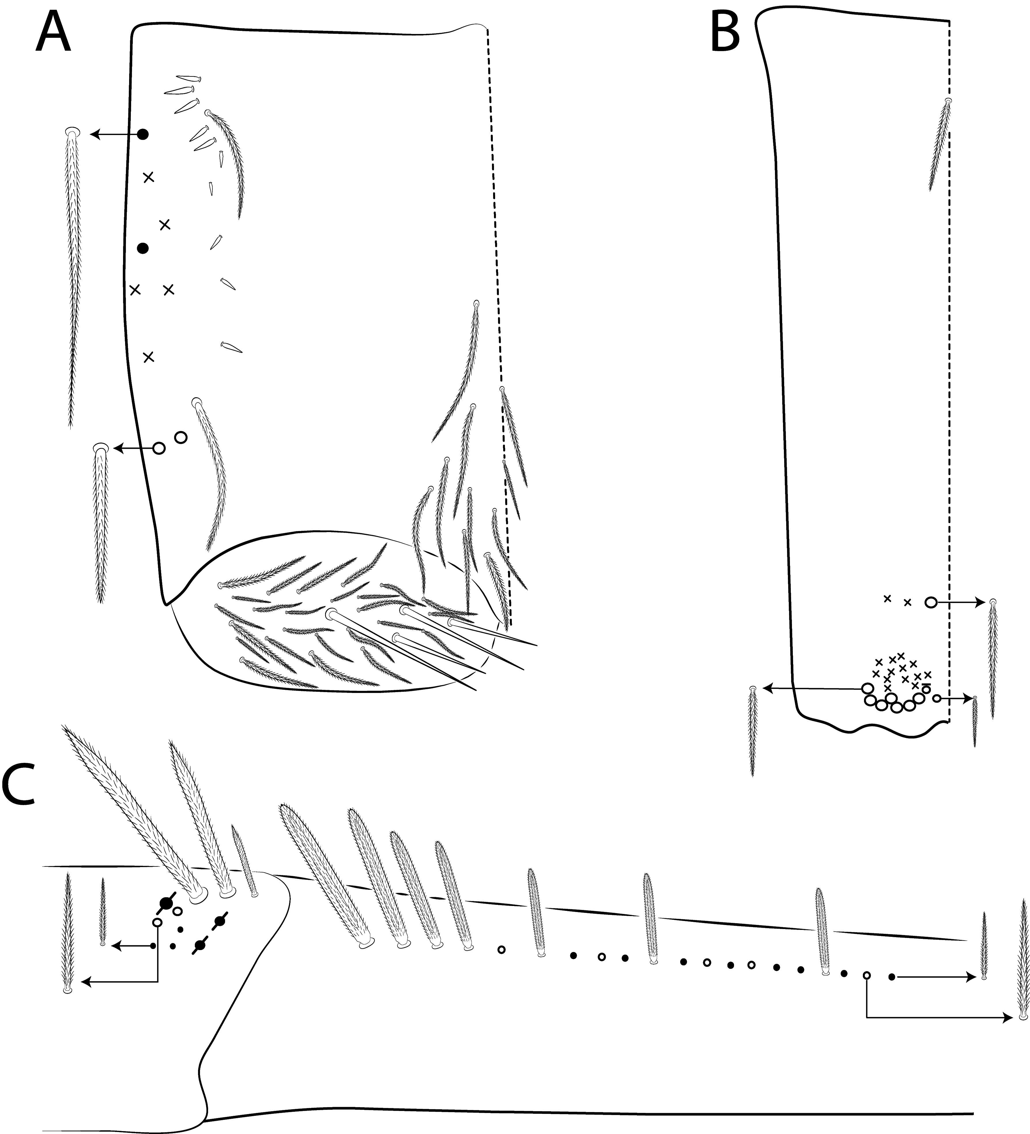 FIGURE 29A–C. Lepidocyrtinus africanus sp. nov.: A, collophore chaetotaxy (lateral view); B, manubrium ventral chaetotaxy; C, chaetotaxy of the manubrial plate and proximal dens (lateral view).