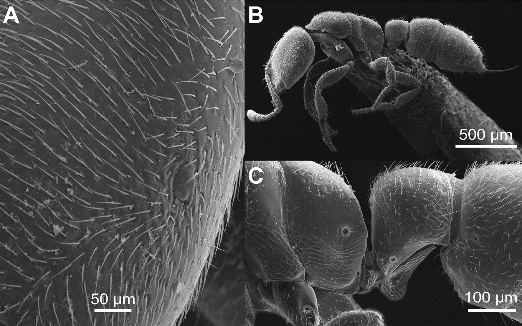 FIGURE 17. Worker of Prionopelta antillana (Ecuador, Zamora-Chinchipe). A. Head dorsum, note the sculpturing and pilosity; B. Habitus; C. Detail of subpetiolar process.