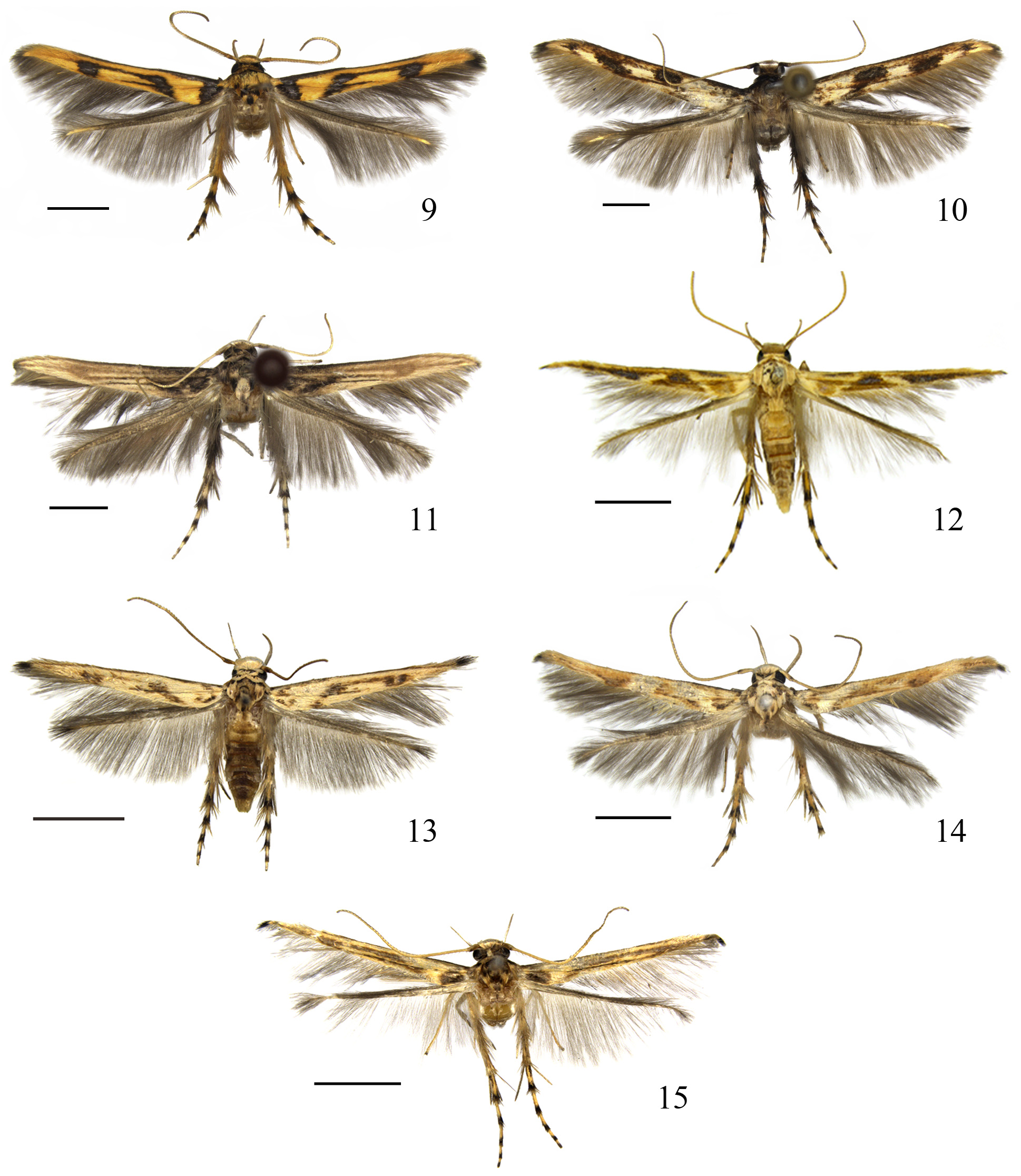 FIGURES 9−15. Adults of Stathmopoda spp. 9, S. guangxiensis sp. nov., holotype, ♂; 10, S. ingena sp. nov., paratype, ♀; 11, S. liberata sp. nov., paratype, ♀; 12, S. purpurata sp. nov., paratype, ♀; 13, S. serrifasciaria sp. nov., paratype, ♀; 14, S. similatridorsalis sp. nov., paratype, ♀; 15, S. spinicornuta sp. nov., holotype, ♂. Scales = 2 mm.