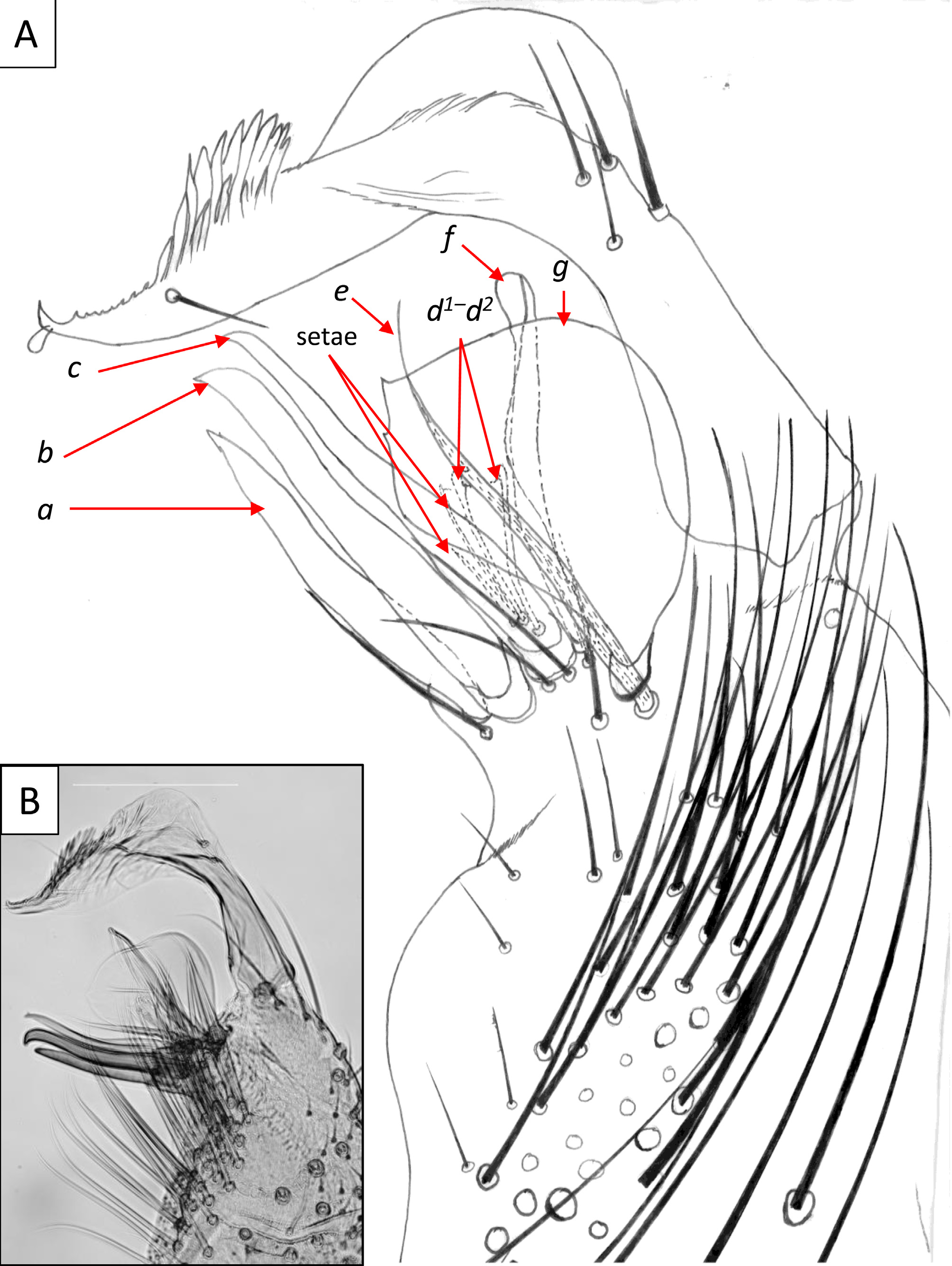 FIGURE 26. Gonocoxite of Culex nebulosus. (A) Drawn depiction; (B) image (100x).
