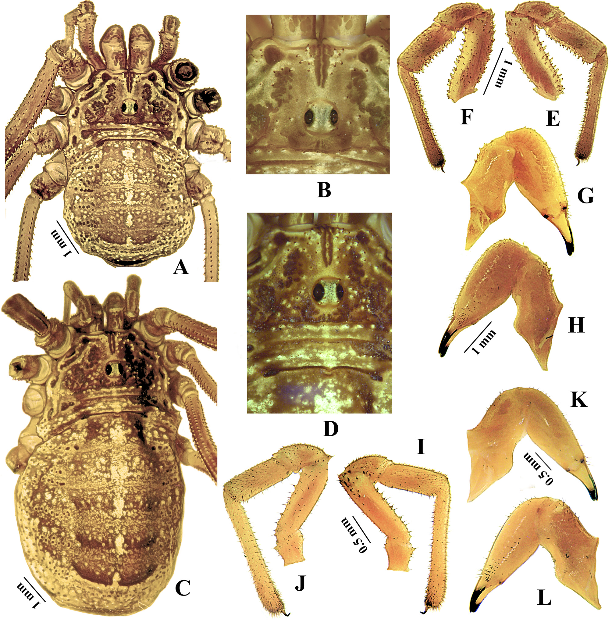 FIGURE 8. Homolophus andreevae Staręga & Snegovaya, 2008: A, male body, dorsal; B, male ocularium, dorsal; C, female body, dorsal; D, female ocularium, dorsal; E, male right pedipalp, ectal; F, male right pedipalp, mesal; G, male right chelicera, ectal; H, male right chelicera, mesal; I, female right pedipalp, ectal; J, female right pedipalp, mesal; K, female right chelicera, ectal; L, female right chelicera, mesal.