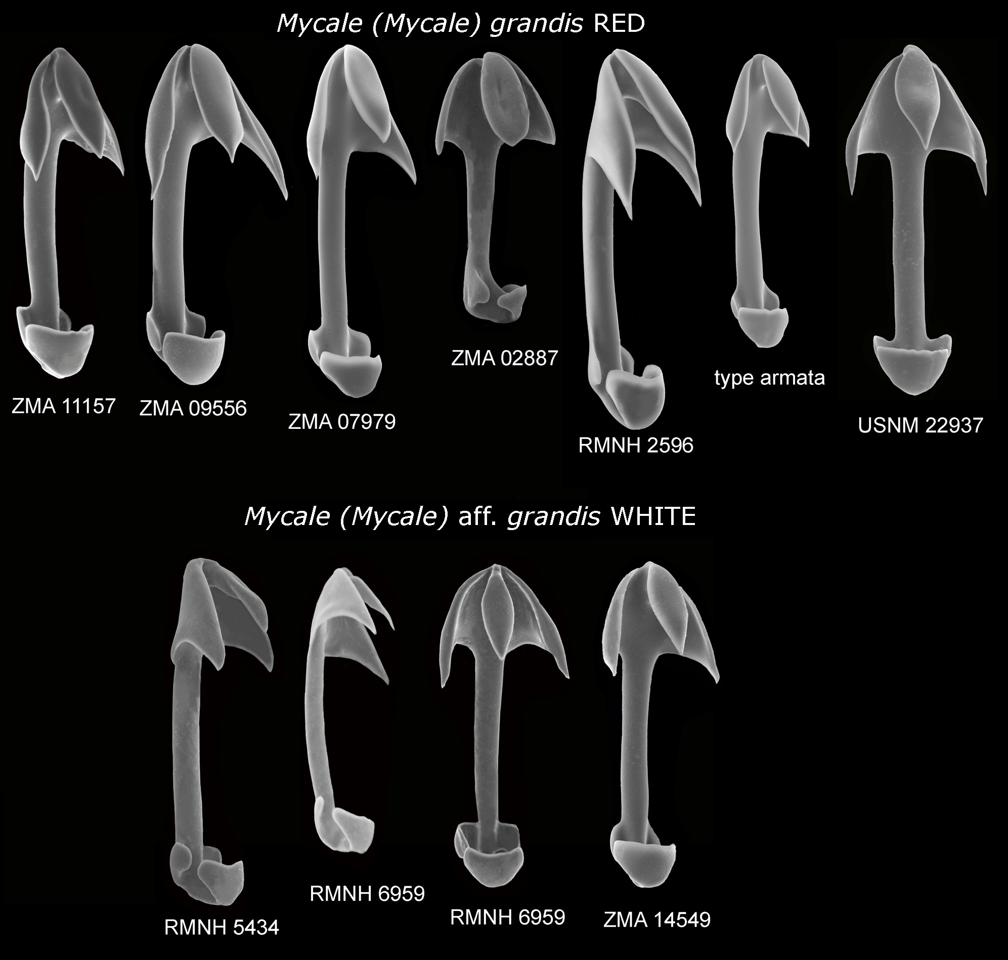 FIGURE 85. Mycale (Mycale) grandis (Gray, 1867), comparison of anisochelae Ia to demonstrate similarity of red and white specimens. Upper row red specimens, lower row white specimens; at the upper right, anisochela I of holotype of Mycale armata Thiele, 1903, ZMB 3157 (= Mycale (M.) grandis) of which no live color is known, and the holotype of Oxymycale strongylophora De Laubenfels, 1954 (= Mycale (M.) grandis'red').