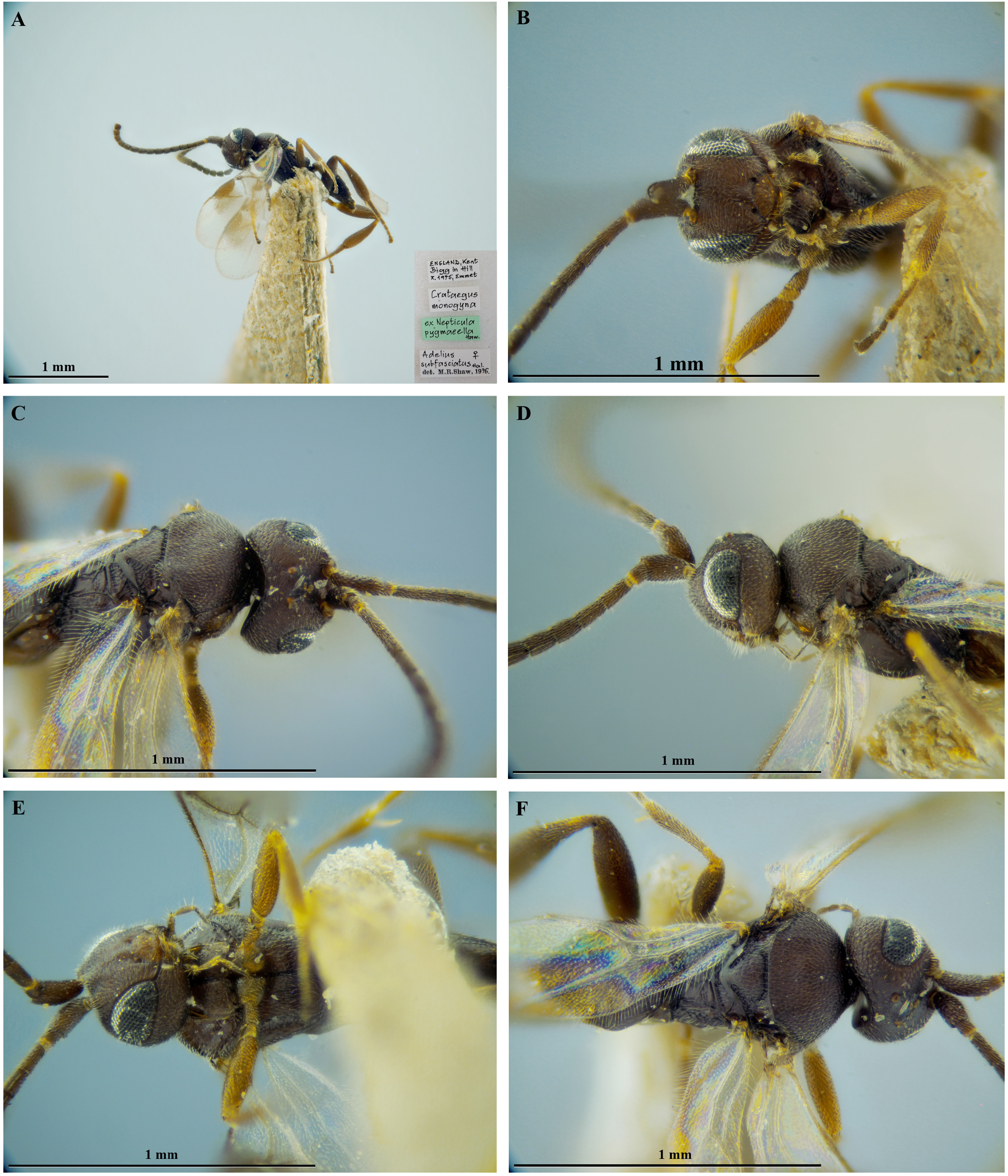 FIGURE 5. Adelius subfasciatus Haliday, 1833, female A) Habitus, lateral view, B) Head, anterior view, C) Head, dorsal view, D) Head, lateral view, E) Head, ventral view, F) Mesosoma, dorsal view.