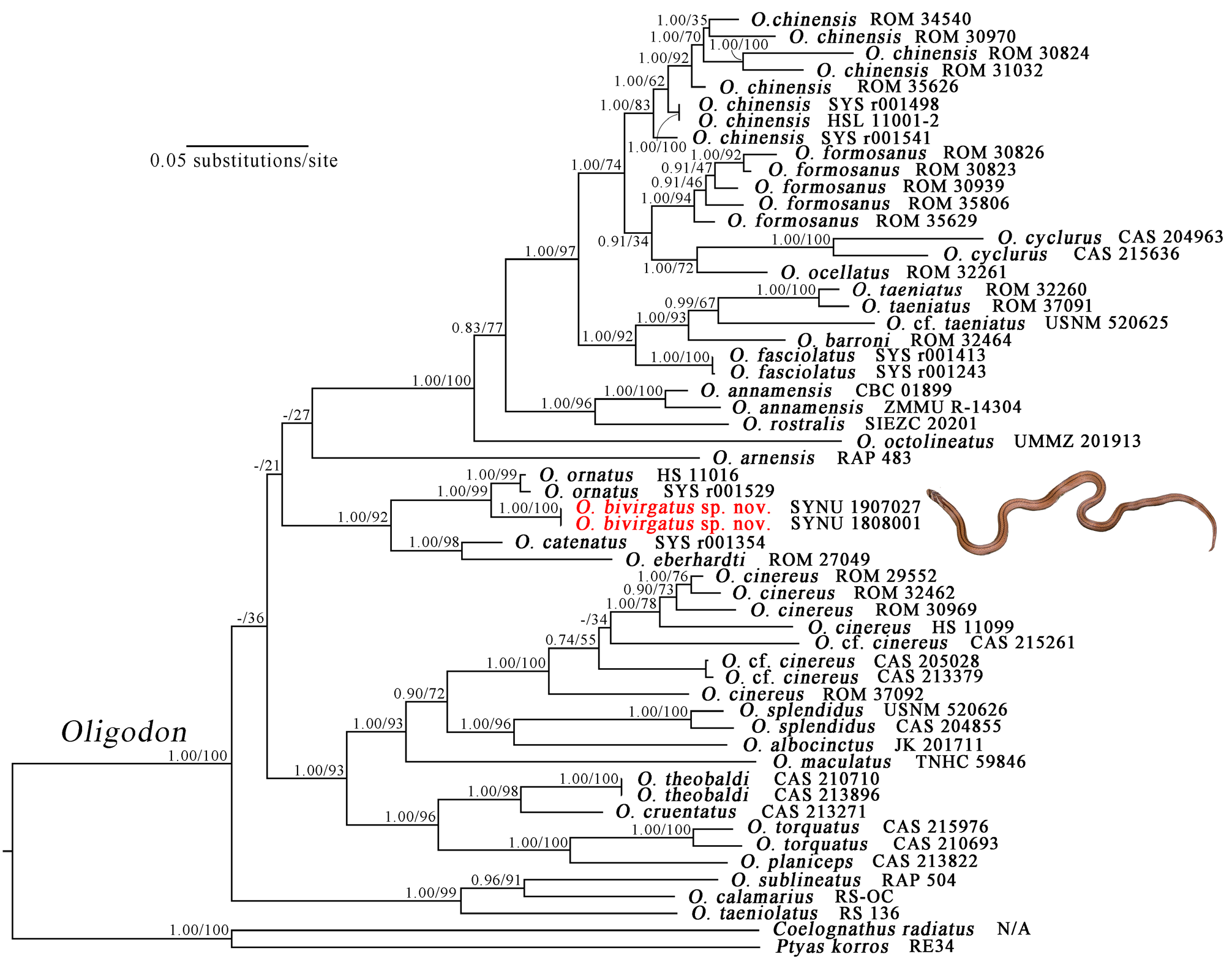FIGURE 1. Maximum Likelihood tree of Oligodon derived from the analysis of 1897 bp of 12S rRNA-16S rRNA gene sequences. Numbers at tree nodes correspond to BI PP/ML BS support values, respectively; n-dash denotes no support.