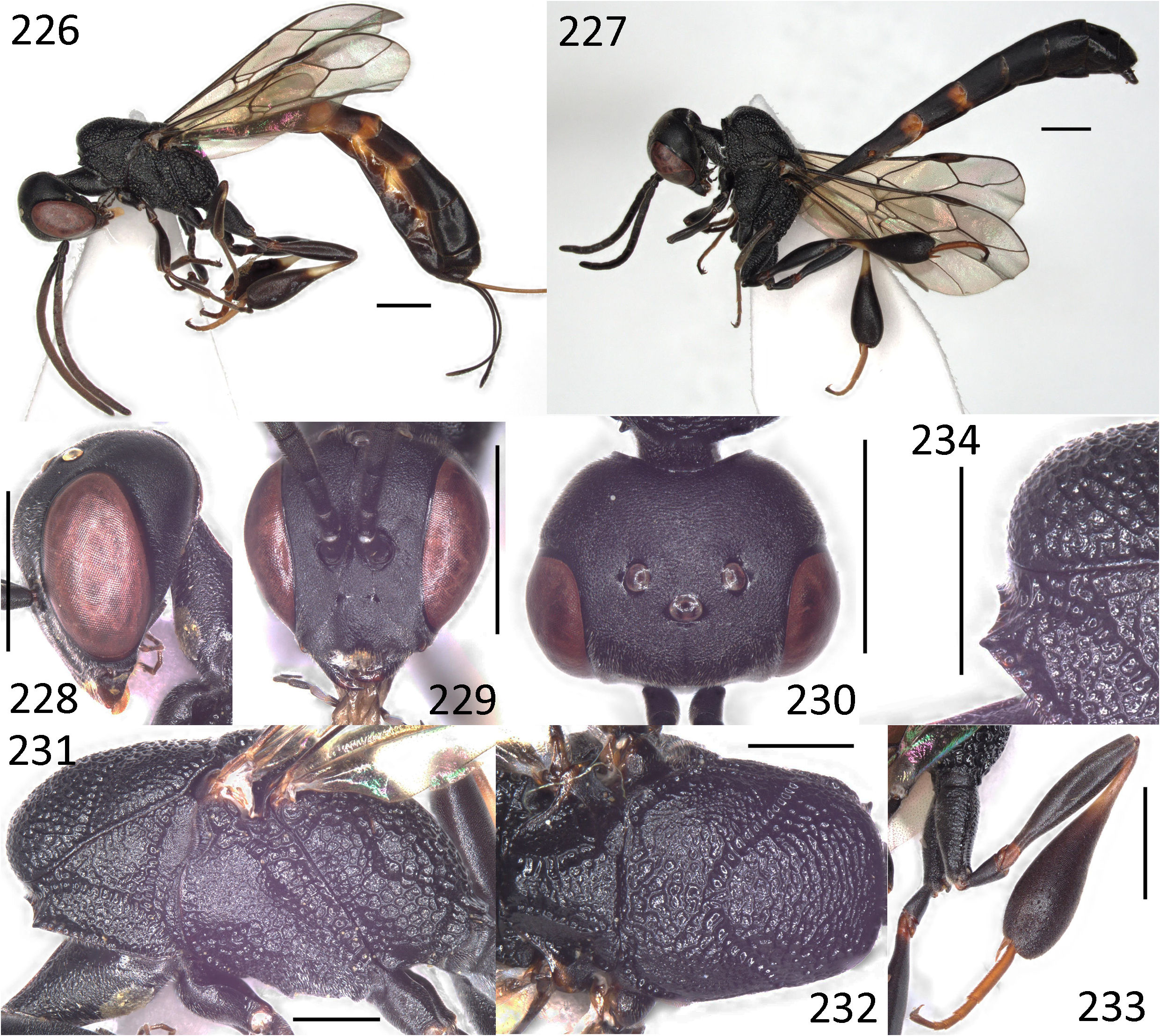 FIGURES 226–234. Gasteruption undulatum (Abeille de Perrin, 1879). 226—female, lateral habitus, 227—male, lateral habitus, 228—female, lateral head, 229—female, frontal head, 230—female, dorsal head, 231—female, lateral mesosoma, 232—female, dorsal mesosoma, 233—female, third leg, 234—female, pronotal teeth. Scale bars represent 1 mm.