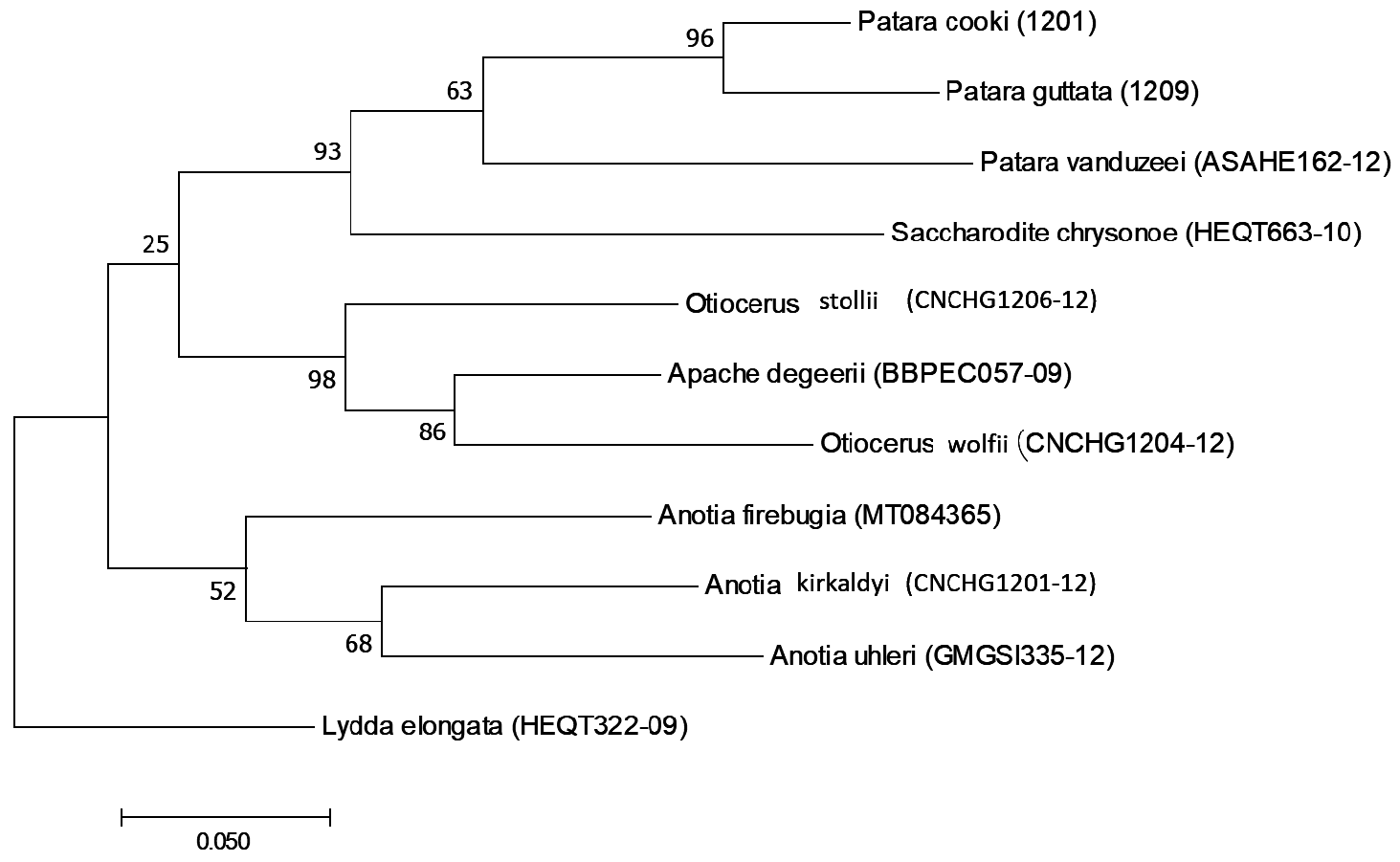 FIGURE 7. Maximum likelihood phylogenetic tree (1,000 replicates) exhibiting the relationship of Patara cooki sp. n. to other members of the Otiocerinae based on COI sequence data.