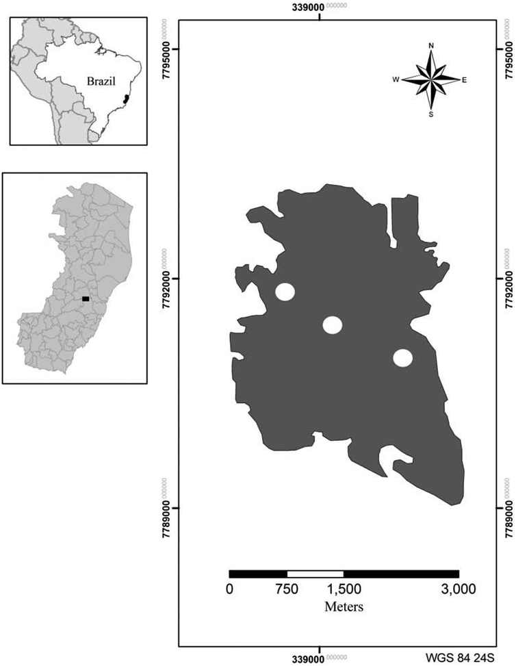Figure 1. Study area showing the trapping grid areas (white circles) at the Biological Station Santa Lúcia, Espírito Santo, Brazil.