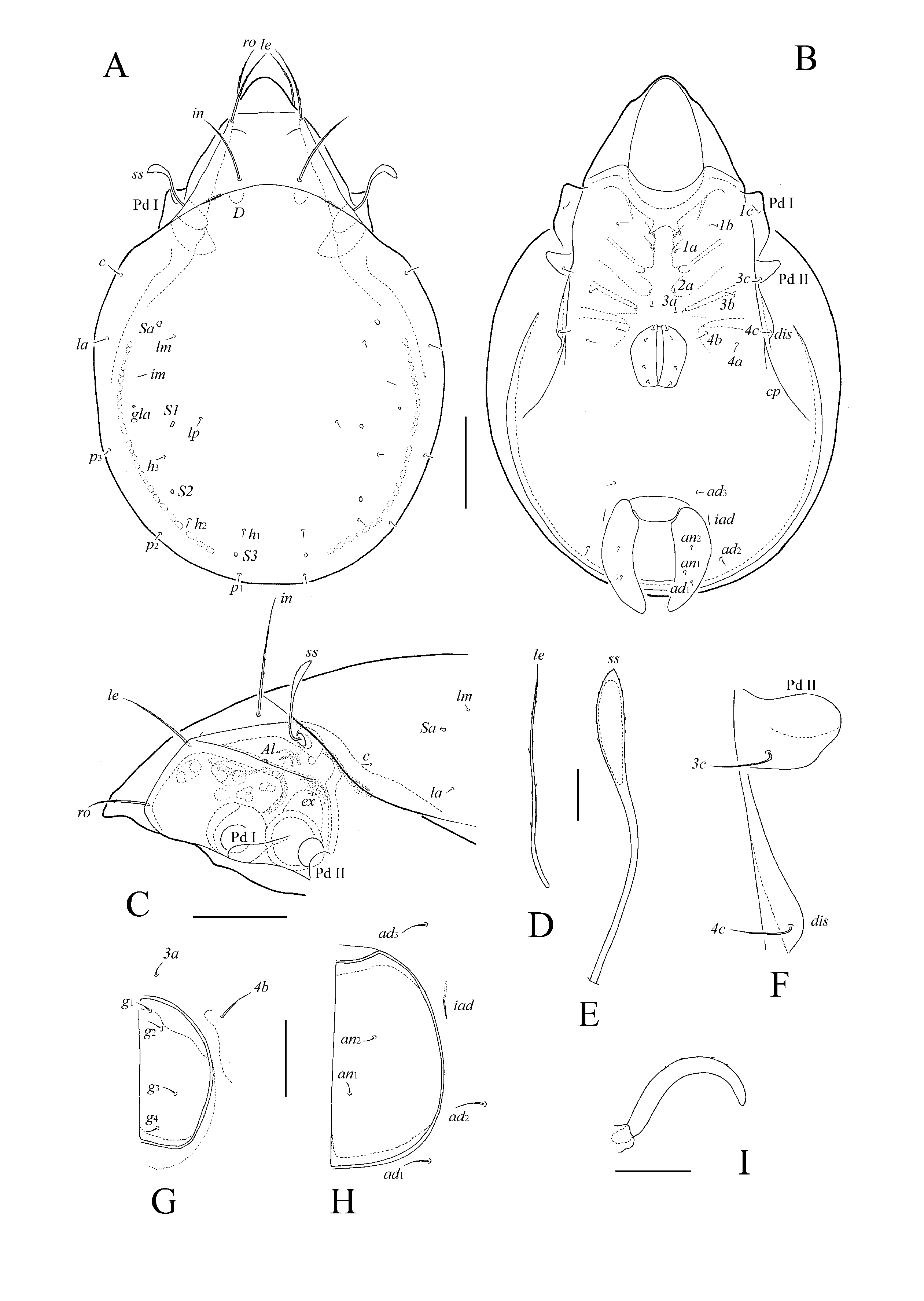 FIGURE 3: Monoschelobates parvus Balogh and Mahunka, 1969: A – body dorsally; B – body ventrally (gnathosoma and legs not illustrated); C – prodorsum and anterior part of notogaster laterally (gnathosoma and legs not illustrated); D – lamellar seta; E – sensillus; F – pedotectum II, discidium and epimeral setae 3c, 4c in dissected specimen; G – left genital plate and epimaral setae 3a, 4b; H – left anal plate and adanal setae ad1 -ad3; I – claw on leg I. Scale bars (A-C) 50 µm, scale bar (D-F, I) 10 µm, scale bar (G, H) 10 µm.