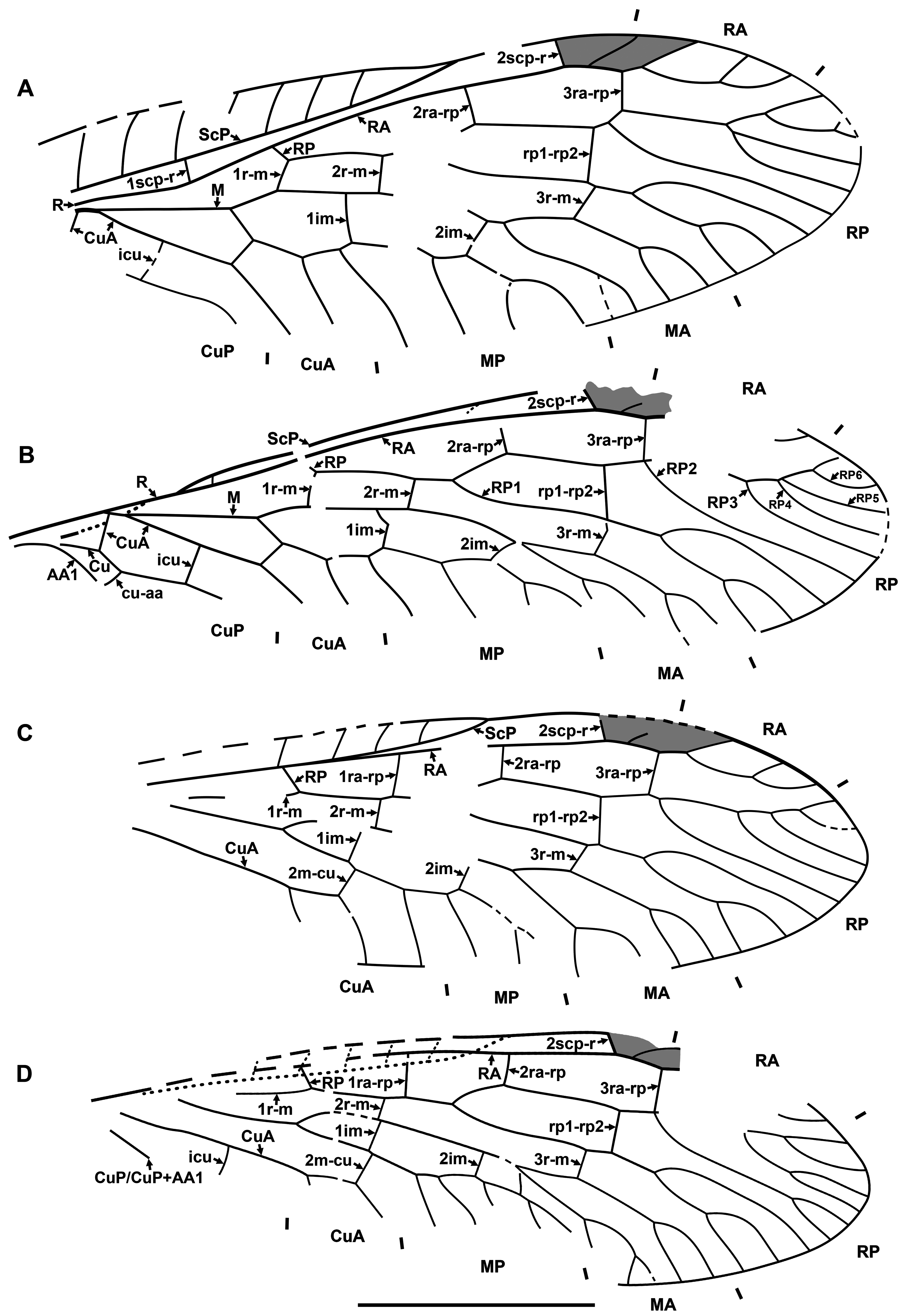 FIGURE 2. Wing venation of Megaraphidia antiquissima sp. nov., holotype RBCM P1555. A, right forewing, B, left forewing; C, right forewing; D, left hind wing. Scale bar = 3 mm (all to scale).