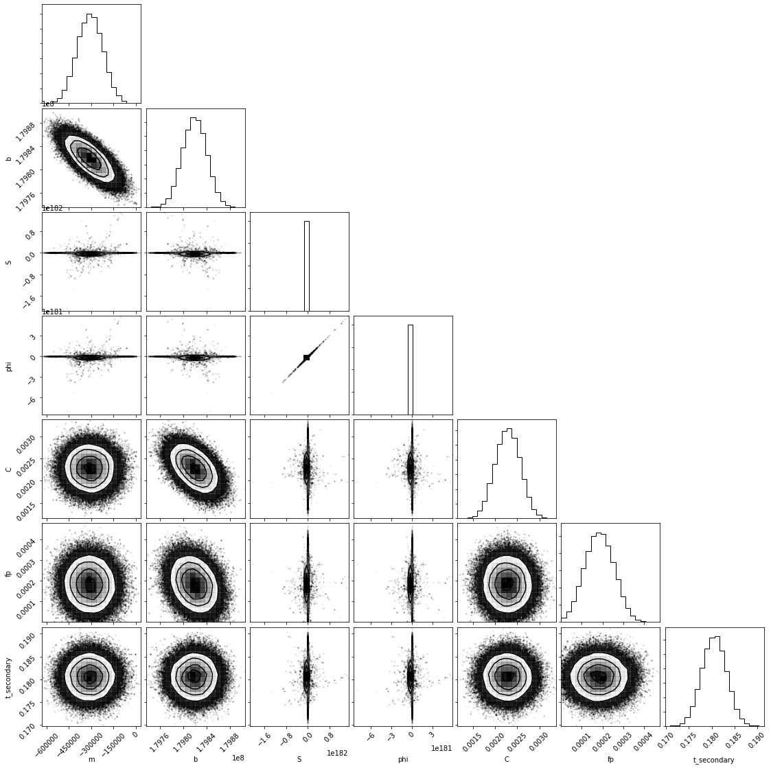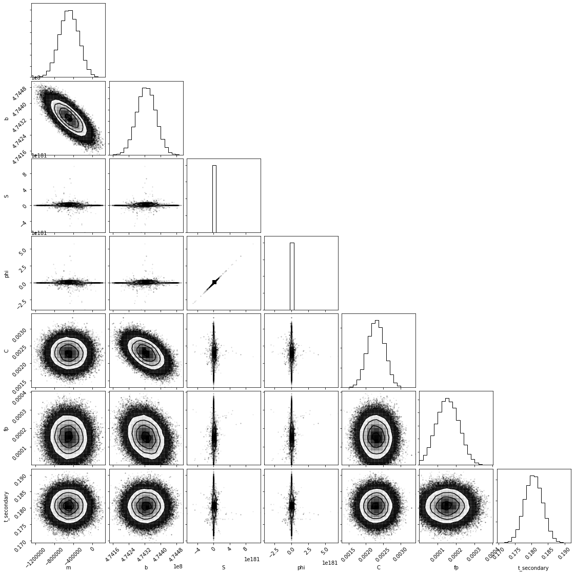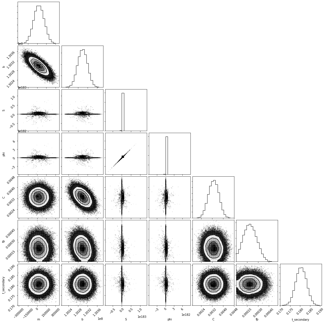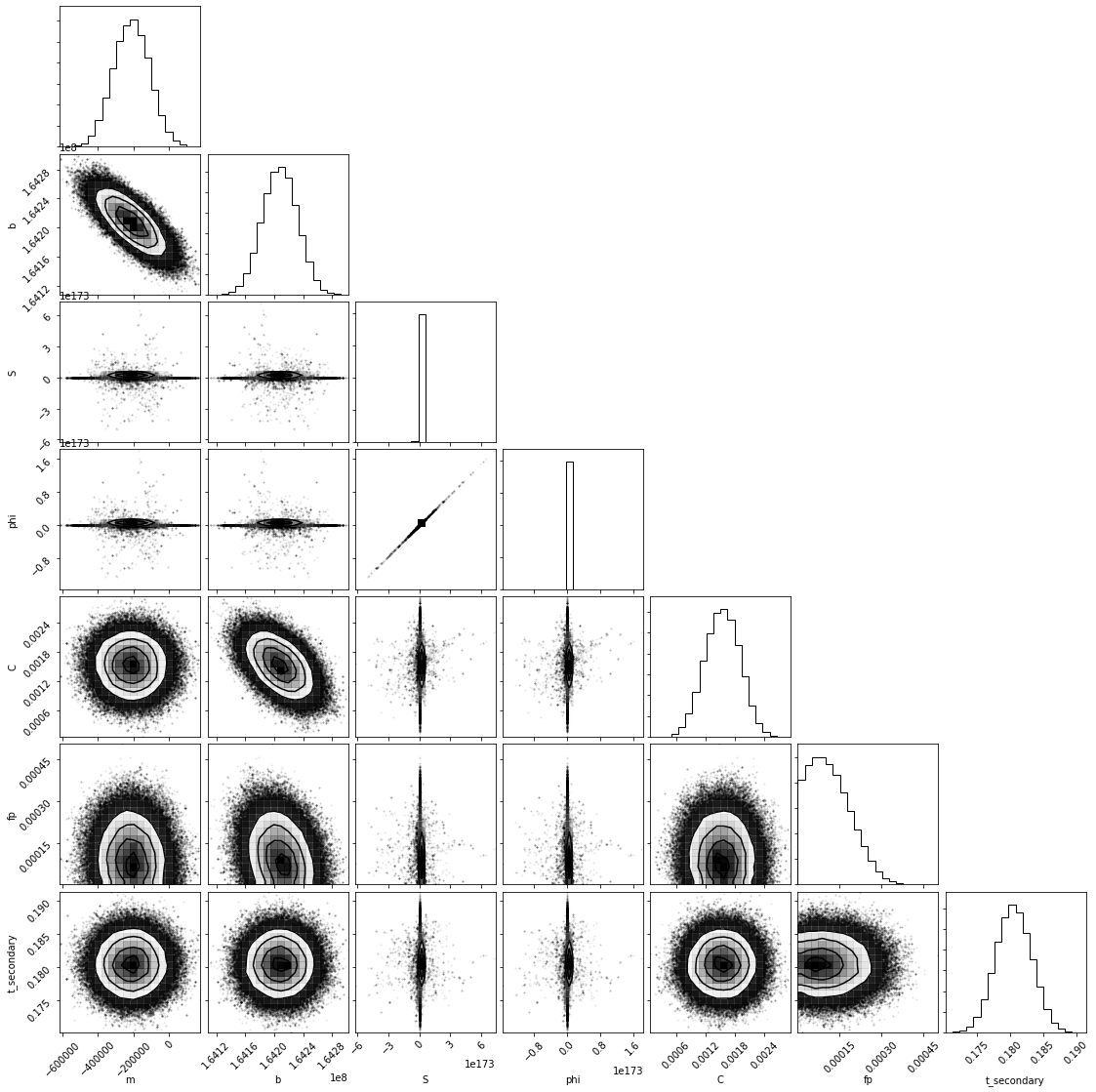 The two 'white' light corner plots consider two scenarios: a fixed mid-eclipse time based on the expected occurrence time and a mid-eclipse time set as a free parameter. The three spectroscopic corner plots then look at the observations divided into three equal wavelength bins of width 0.20 μm centered at 1.18, 1.38, and 1.58 μm. The spectroscopic analysis was done under the scenario of a free mid-eclipse time.