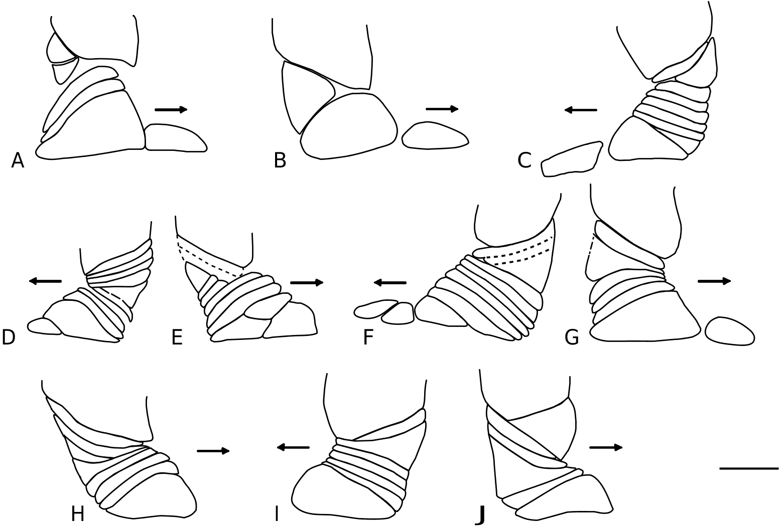 FIG. 10. — Discoserra pectinodon n. gen. n. sp., branchiostegal series, Lower Carboniferous Bear Gulch Limestone, Heath Formation, Fergus County, Montana (USA). A, MV 2956; B, MV 3811; C, CM 27292B; D, E, CM 44500A, B; F, CM 35211A; G, CM 35215B; H, FMNH PF 10207; I, J, CM 37547A, B. Scale: 3 mm.