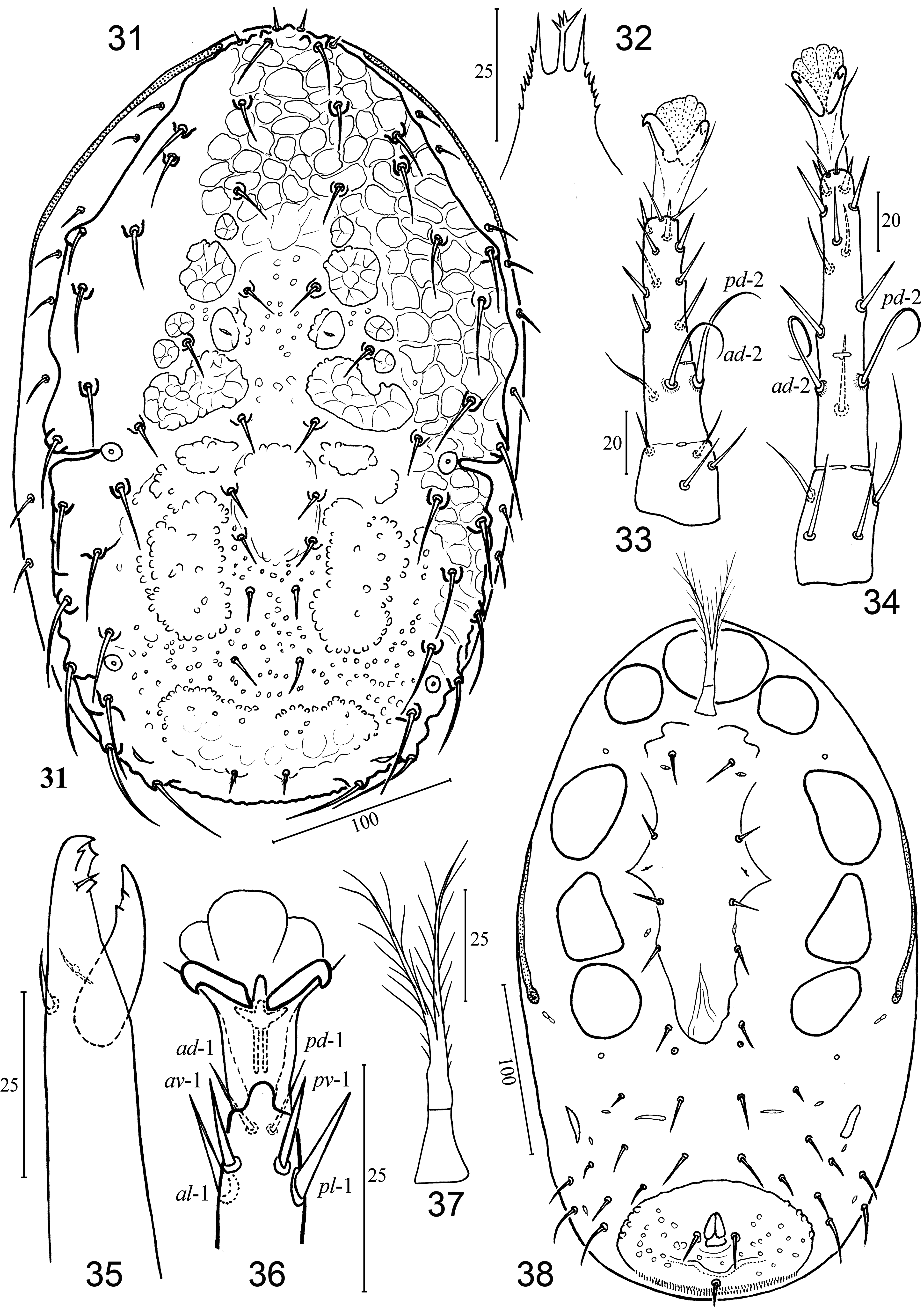 FIGURES 31–38. Iphidonopsis sculptus Gwiazdowicz, 2004. 31, 32, 35, 37, 38. Deutonymph; 33, 34. Female; 36. Male. 31. Idiosomal dorsum; 32. Gnathotectum; 33. Tarsus II; 34. Tarsus IV; 35. Chelicera; 36. Ambulacrum and apex of tarsus II; 37. Tritosternum; 38. Idiosomal venter.