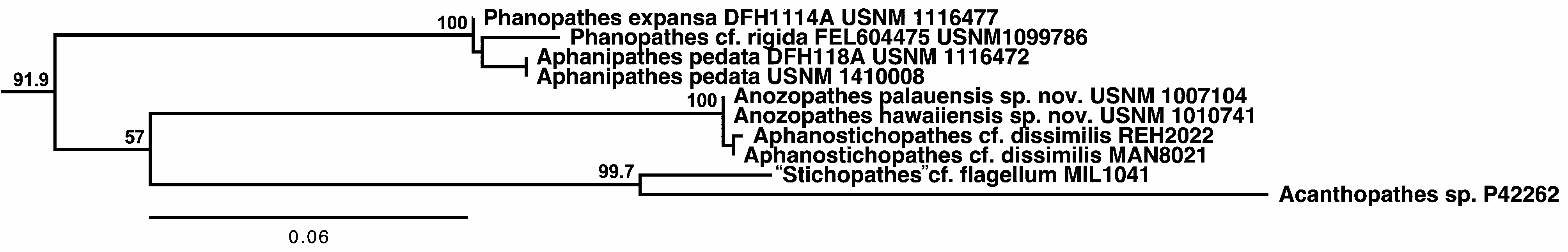 FIGURE 1. A maximum likelihood-based phylogenetic tree of the family Aphanipathidae based on mitochondrial nad5-IGRnad1 sequence data (Chery et al. 2018). The original tree consisted of 112 taxa and 682 sites and was rooted internally with the Leiopathidae. PhyML used the GTR+G model of sequence evolution and 1,000 bootstrap replicates.