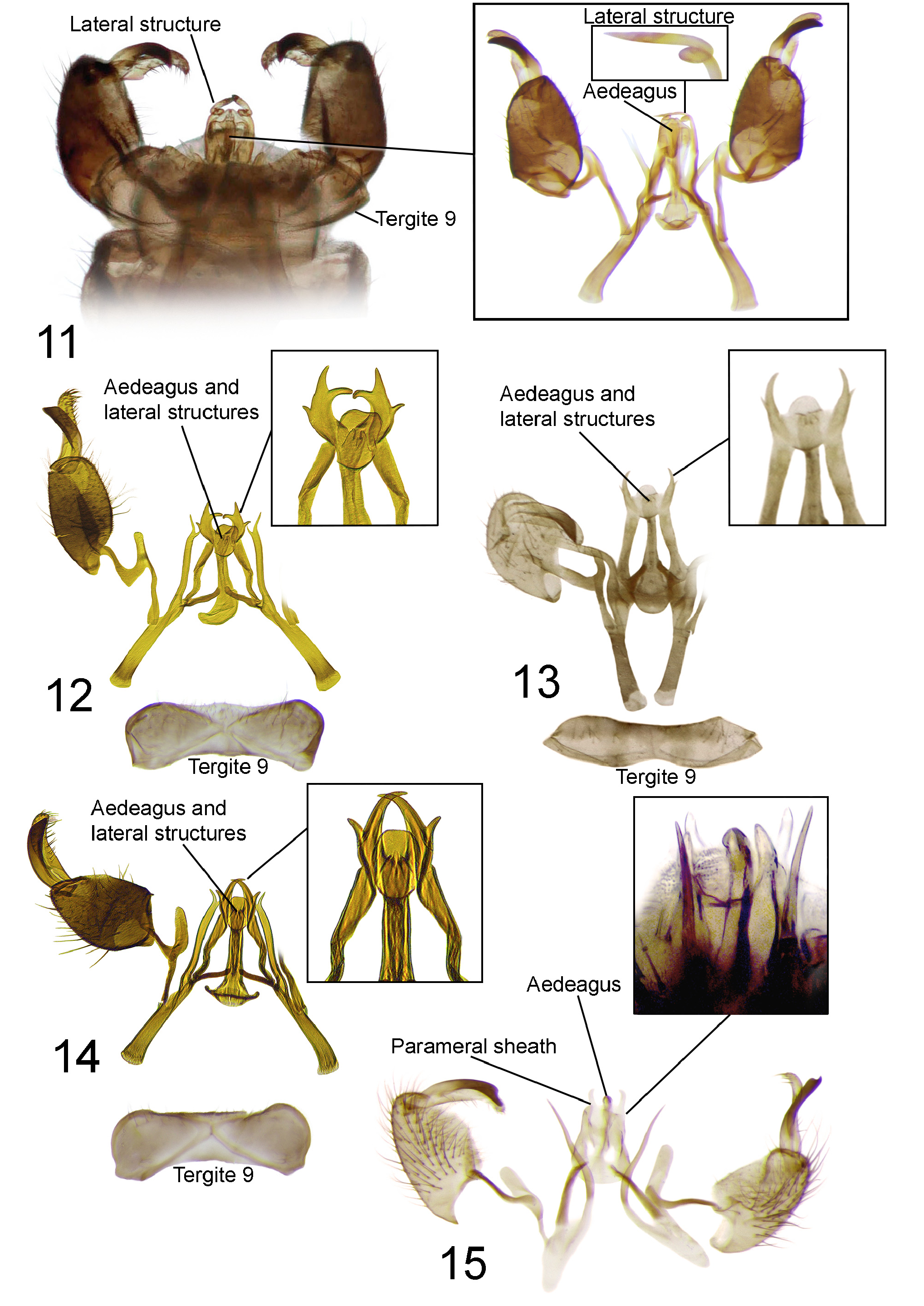 FIGURES 11–15. Distinctive features of genus Antocha in Sichuan, China. 11. male genitalia and genital structures, dorsal view of A. spiralis; 12. male genital structures and tergite 9 of A. constricta; 13. male genital structures and tergite 9 of A. multidentata; 14. male genital structures and tergite 9 of A. quadrifurca; 15. male genital structures and tergite 9 of A. pulchra sp. nov., paratype.