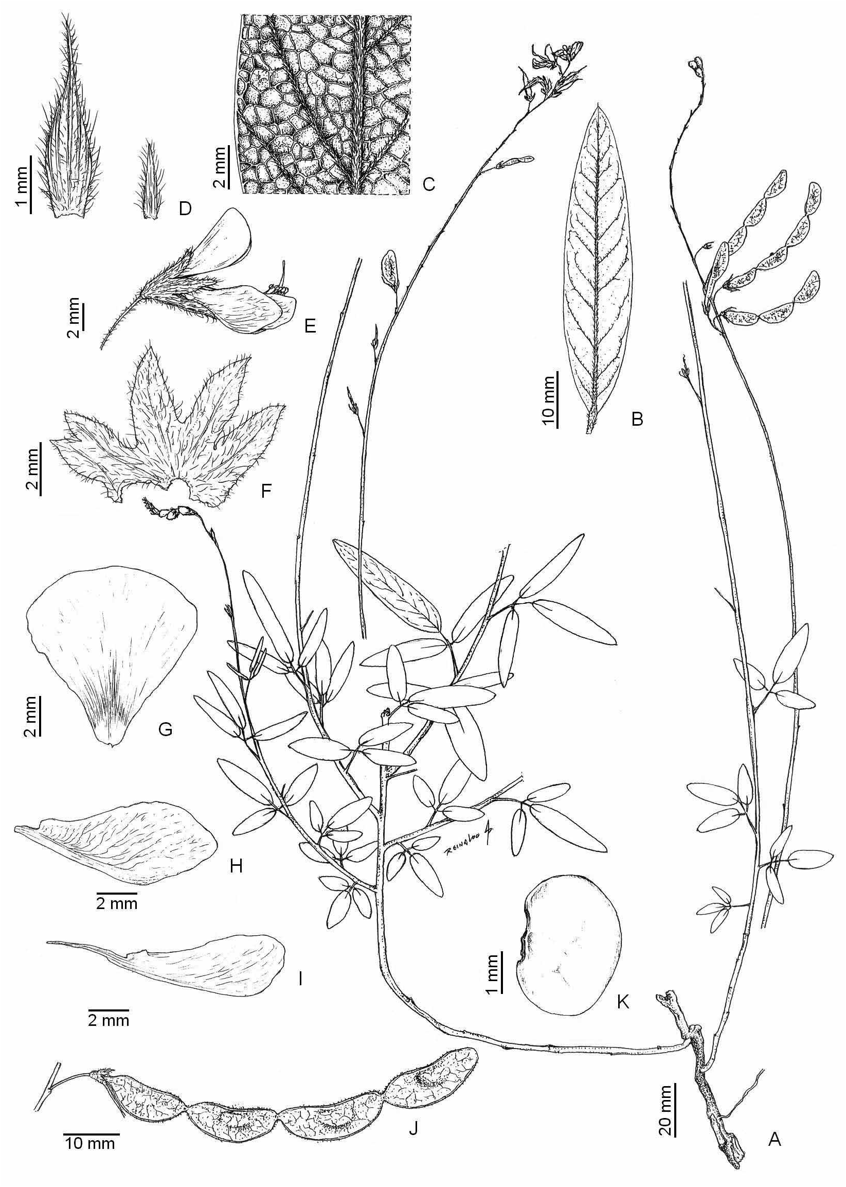 FIGURE 1. Desmodium burkartii. A. Habit. B. Leaflet. C. Detail of the lower surface of the leaflet highlighting indumentum and venation. D. Primary (left) and secondary bracts (right). E. Flower. F. Calyx opened out. G. Standard petal. H. Wing petal. I. Keel petal. J. Fruit. K. Seed (all from C.Quarín 3513, paratype). Drawn by R.Pinto.