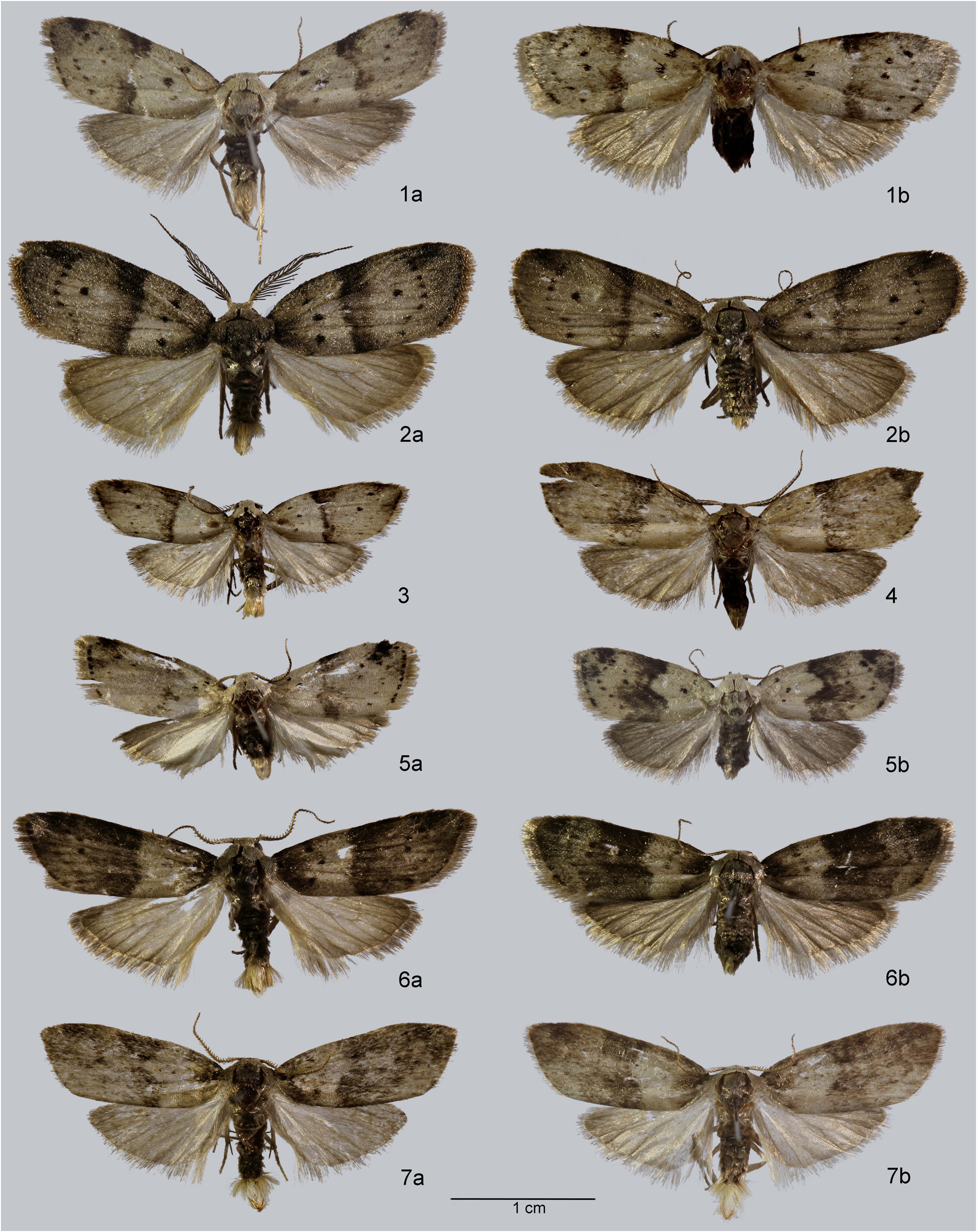 FIGURES 1˗7. Adults of Stictane from Laos. 1a. S. munda, male (INU˗1974L). 1b. ditto, female (INU˗1991L). 2a. S. pectenicorniculum, male (INU˗10051L). 2b. ditto, female (INU˗10256L). 3. S. pectinata, male (INU˗10257L). 4. S. fuscus, male (INU˗10258L). 5a. S. bokorensis, male (INU˗10454L). 5b. ditto, female (INU˗1975L). 6a. S. obscura, male (INU˗10260L). 6b. ditto, female (INU˗10287L). 7a. S. bayarsaikhanae, male (INU˗10462L). 7b. ditto, male (INU˗1751L).