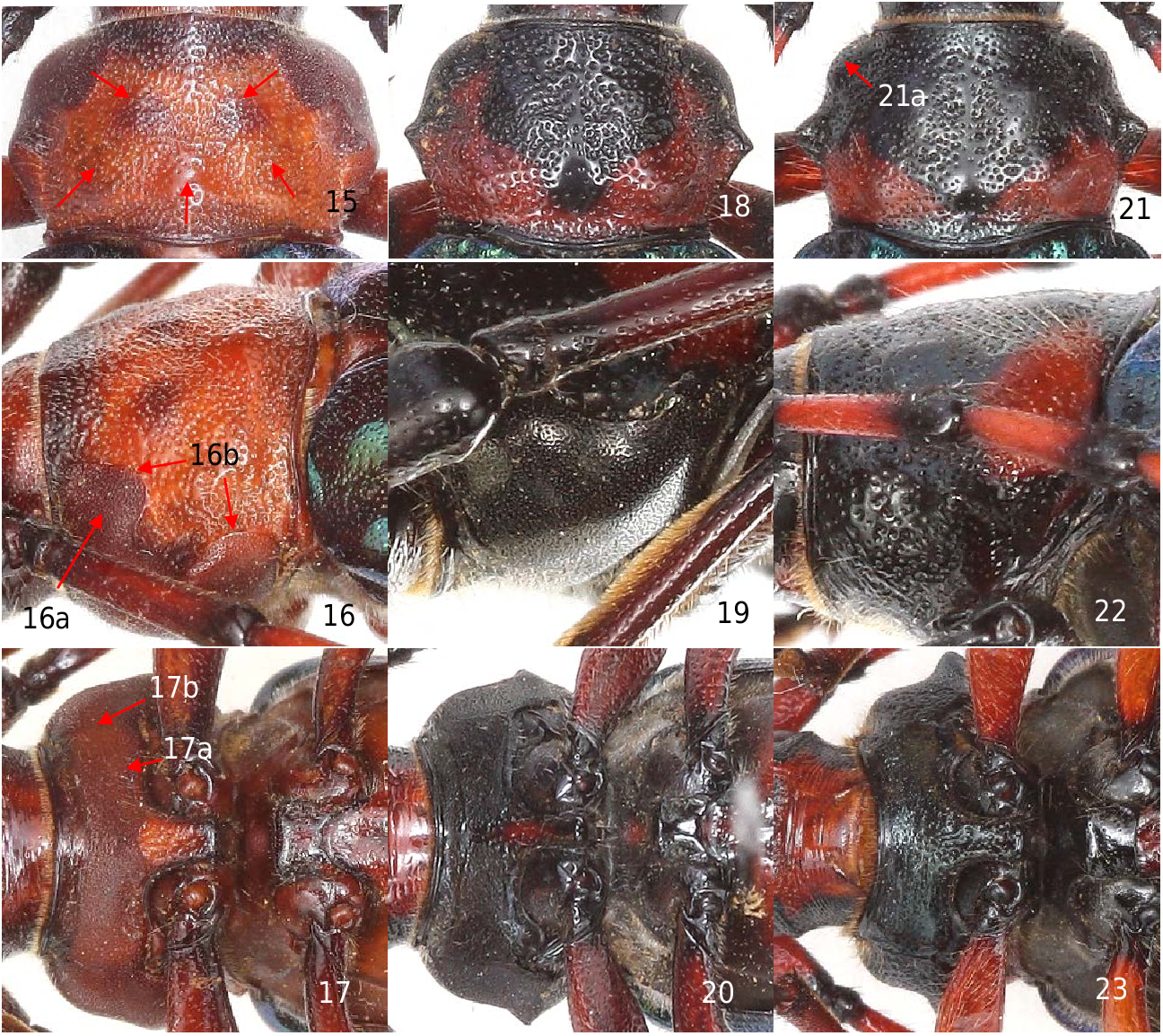 Figures 15–23. Pronotal and prosternal characteristic of Stenaspis verticalis: 15–17) S. verticalis, male, Jalisco, MEX with sides of pronotum rounded. 15) Disc coarsely punctate with 5 vague calli (red arrows). 16: 16a) Proepisternum inflated and finely punctate (dark reddish area). 16: 16b) Demarcation of proepisternal finely punctate area from coarsely punctate dorsum of disc. 17: 17a) Subrectangular impressed area. 17: 17b) Vague demarcation dividing proepisternum from the subrectangular impressed area. 18, 20) S. verticalis, male, Nuevo Leon, MEX with side of pronotum with distinct lateral tubercles. 19) S. verticalis, male, Puebla, MEX with proepisternum inflated and finely punctate clearly demarcated from dorsum. 21–22) S. verticalis, female, Guerrero, MEX with side of pronotum distinctly tuberculate. 21: 21a) Anterior angles obtusely tuberculate. 22) Pronotal disc and proepisternum coarsely punctate. 23) S. verticalis, female, Jalisco, MEX with prosternum coarsely punctate.