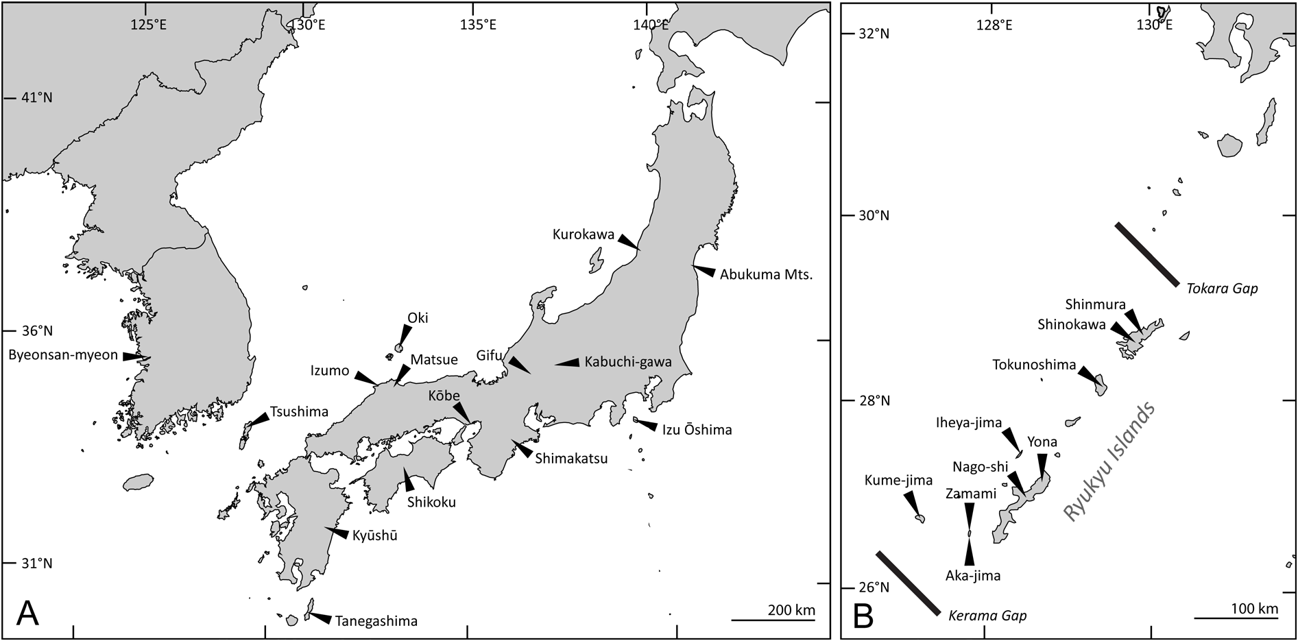 Fig. 10. Map showing records of A. Elmomorphus brevicornis Sharp, 1888. B. Elmomorphus amamiensis Nomura, 1959.