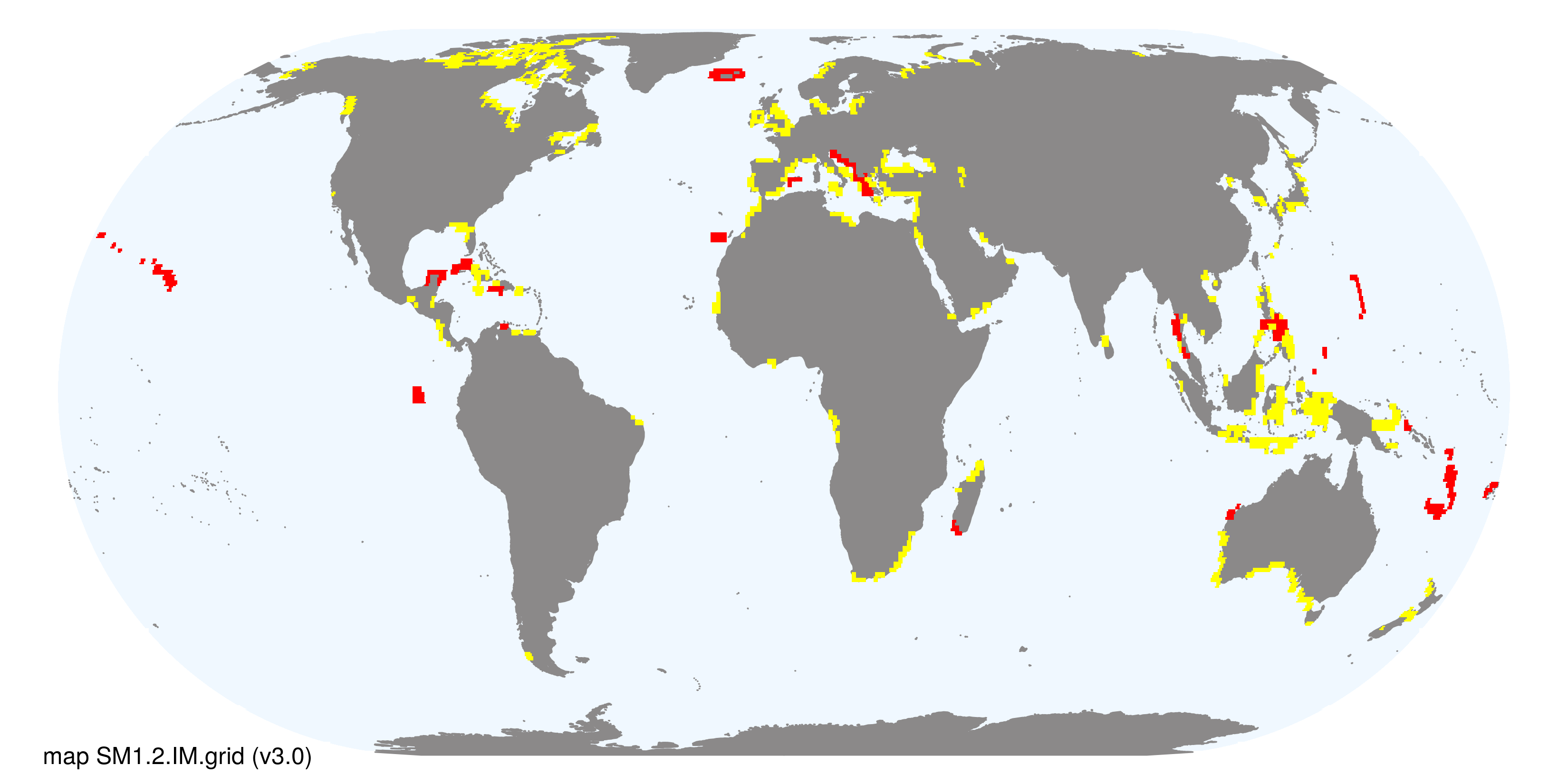 The descriptive profiles provide brief summaries of key ecological traits and processes, maps are indicative of global distribution patterns, and are not intended to represent fine-scale patterns. The maps show areas of the world containing major (value of 1, coloured red) or minor occurrences (value of 2, coloured yellow) of each ecosystem functional group. Minor occurrences are areas where an ecosystem functional group is scattered in patches within matrices of other ecosystem functional groups or where they occur in substantial areas, but only within a segment of a larger region. Given bounds of resolution and accuracy of source data, the maps should be used to query which EFG are likely to occur within areas, rather than which occur at particular point locations. Detailed methods and references for the maps are included in the profile (xml format).