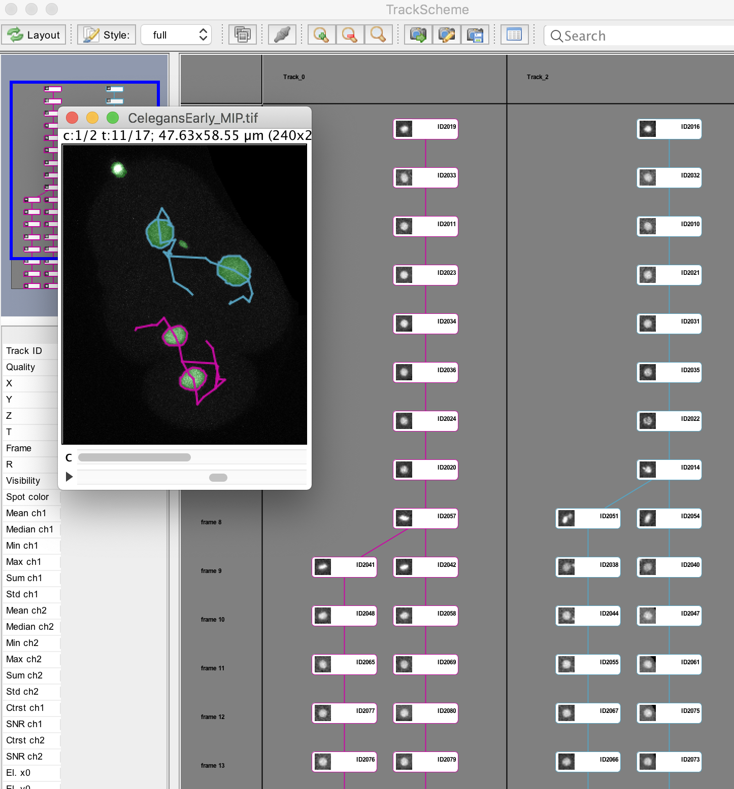 The dataset includes the TrackMate XML file resulting from tracking this movie.