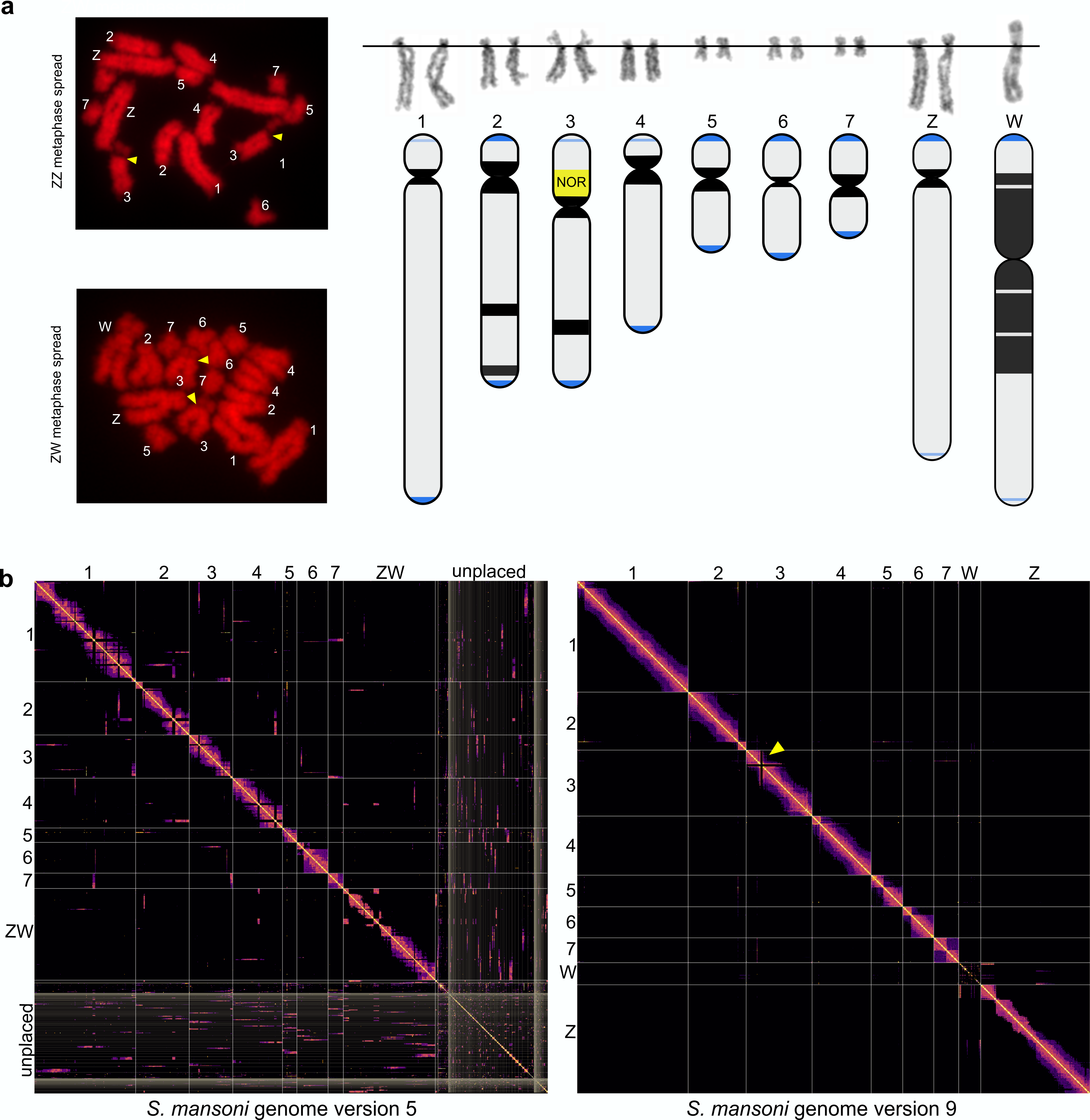 Schistosoma mansoni has a diploid genome of approximately 380 MB, organized in 7 pairs of autosomes and 2 sex chromosomes. The original Schistosoma mansoni Genome Project was completed by the Wellcome Sanger Institute in collaboration with The Institute for Genome Research using a Whole Genome Shotgun sequencing strategy. The draft assembly was subsequently improved first by incorporating Illumina reads from a clonal (single-miracidial) infection and more recently by incorporating long PacBio reads, HiC, and optical mapping data.