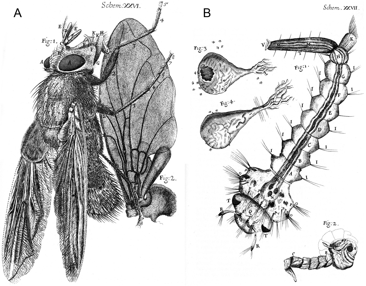 Figure 2. (A) a blow-fly, possibly Calliphora vomitoria (L.) or C. vicina Robineau-Desvoidy, and an entire wing, apparently of a Calliphora species; (B) the larva and pupa of a mosquito, identified as either Culex pipiens L. or C. torrentium Martini. [Also shown are Hooke's drawings of the "marine apiaries" illustrated in Piso's Historia naturalis Brasiliae (1648).]. Engravings reproduced by permission of the Rare Book and Manuscript Library of the University of Pennsylvania.