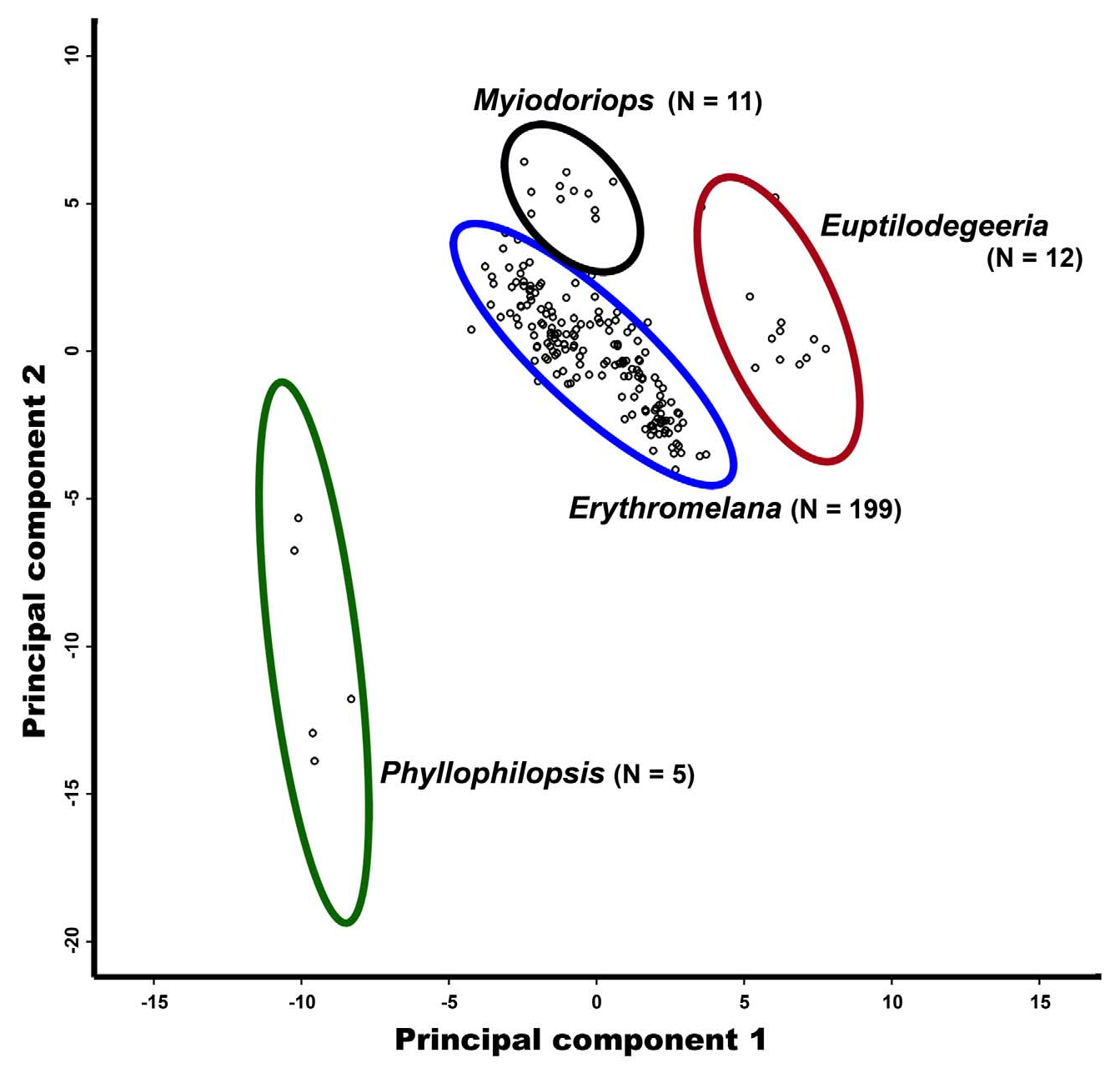 FIGURE 108. Principal components ordination of 227specimens of Erythromelana and related blondeliine genera based on the analysis of 62 morphological characters. Ovals indicate 95% confidence limits.