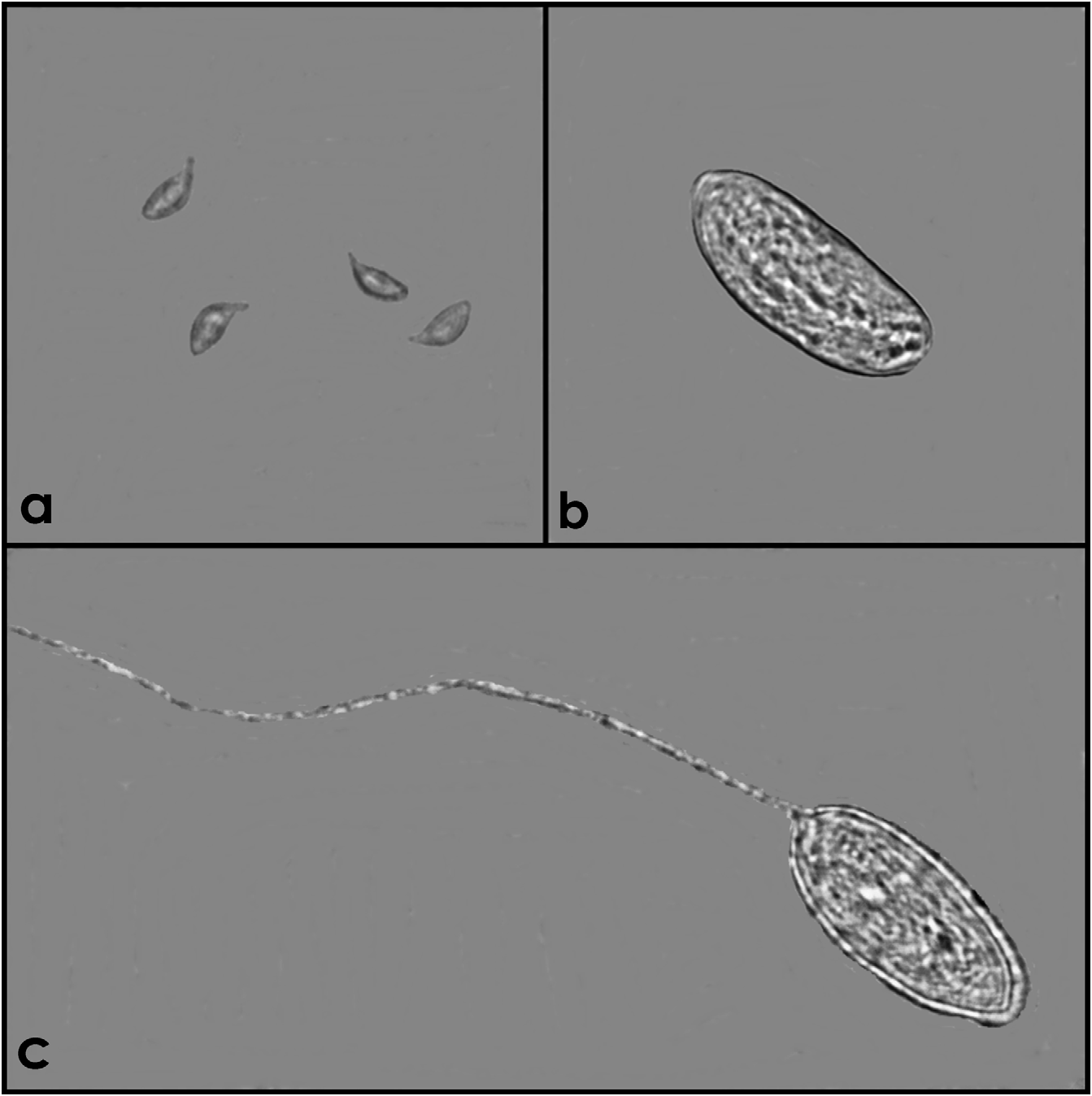 FIGURE 4. Lafoea intorta, sp. nov., nematocysts, ROMIZ B1098: a, microbasic mastigophores, from tentacle; b, holotrichous isorhiza, from hydranth; c, holotrichous isorhiza, partially discharged.