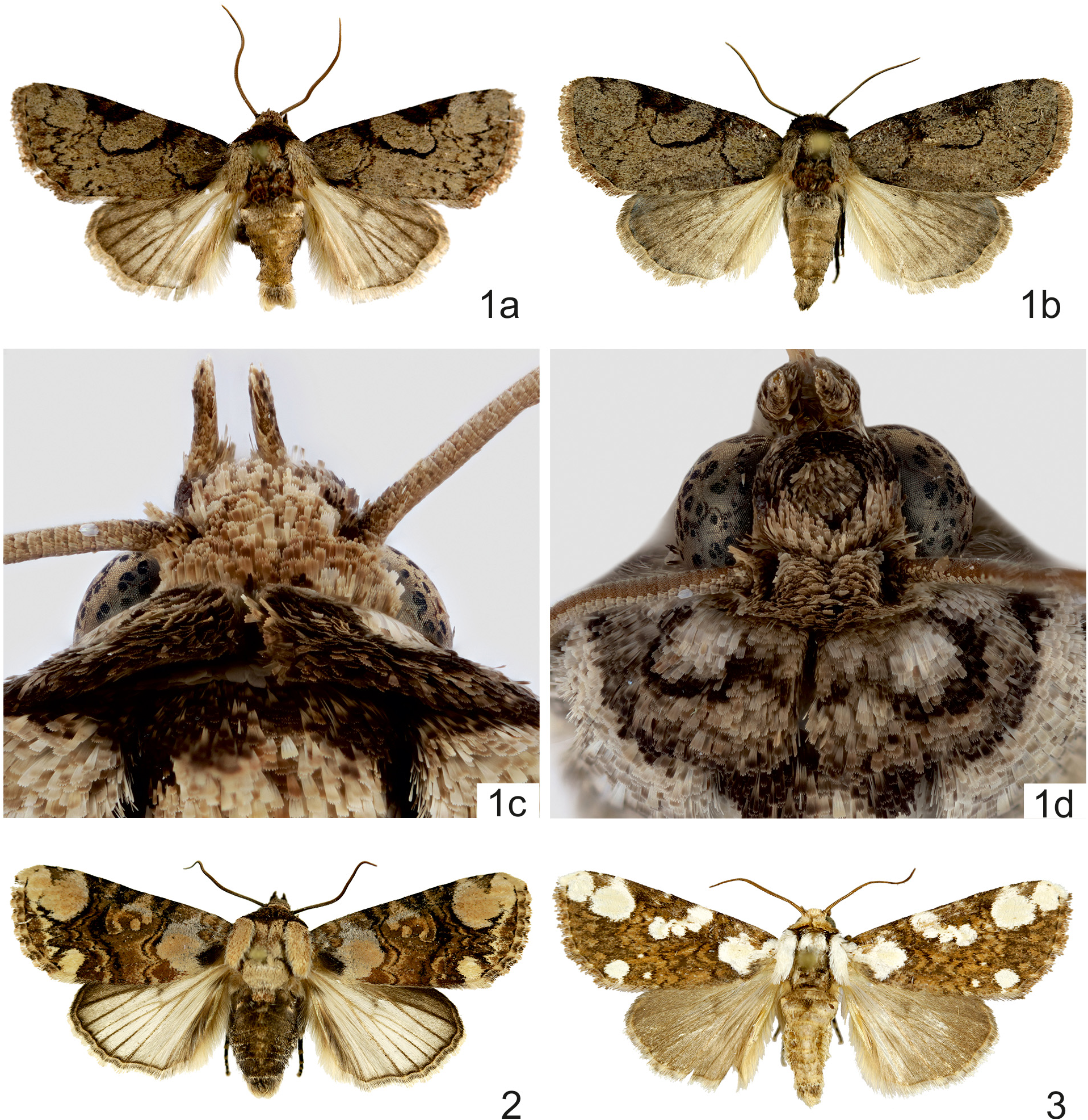 FIGURES 1–3. Facies and frons of Mudaria spp. 1a. M. grisescens sp. nov., paratype male (Thailand: Lampang, Phraya Chae, 09.x.2009), wingspan 31 mm. 1b. M. grisescens sp. nov., paratype female (Thailand: Lampang, Chae Hom, 06.vi.2015), wingpan 31 mm. 1c. M. grisescens paratype female, protuberance on frons, dorsal view (Thailand: Lampang, Phichai, 20.v.2008). 1d. M. grisescens paratype female, protuberance on frons, anterior view (Thailand: Lampang, Chae Hom, 06.vi.2015). 2. M. rudolfi male (Thailand: Lampang, Chae Hom, 08.i.2016), wingspan 42 mm. 3. M. major male (Thailand: Lampang, Phichai, 29.vii.2011), wingspan 40 mm.