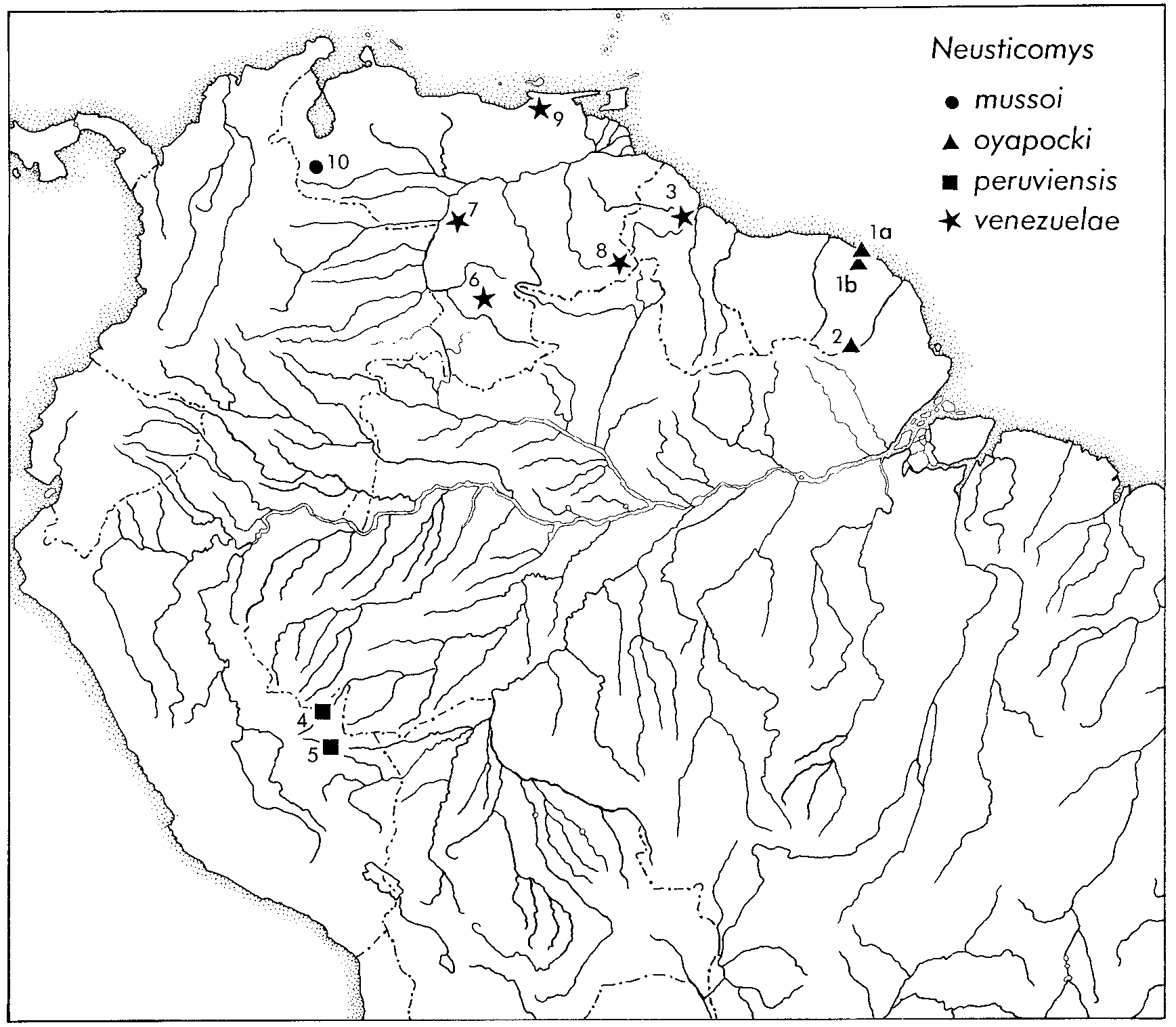 Fig. 50. Known collection localities of lowland species of Neusticomys based on specimens examined and the literature (see citations in footnotes to table 26). 1a, FRENCH GUIANA, Paracou; 1b, FRENCH GUIANA, St.Eugène; 2, FRENCH GUIANA, Trois Sauts; 3, GUYANA, CuyuniMazaruni, Kartabo; 4, PERU, Ucayali, Balta; 5, PERU, Madre de Dios, Pakitza; 6, VENEZUELA, Amazonas, Cerro Duida; 7, VENEZUELA, Bolívar, Los Pijiguaos; 8, VENEZUELA, Bolívar, San Ignacio Yuruanı´; 9, VENEZUELA, Sucre, Río Neverı´; 10, VENEZUELA, Táchira, 14 km SE Pregonero.