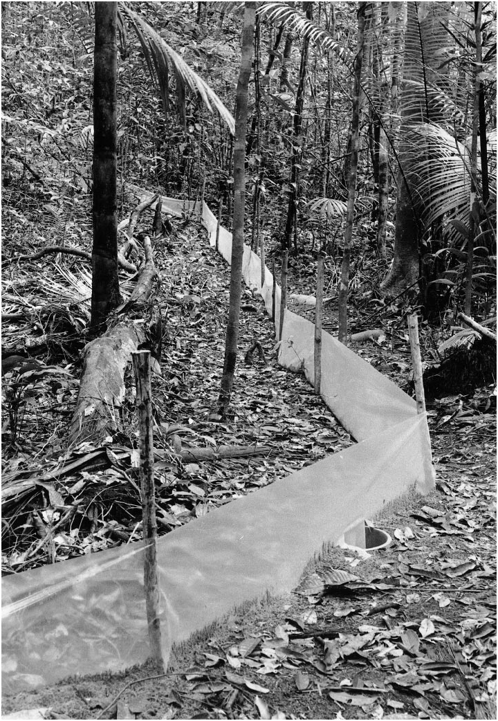 Fig. 51. Pitfall trapline that captured Neusticomys oyapocki in creekside primary forest at Paracou. This trapline roughly paralleled the small stream illustrated in figure 9, which was only about 10 m to the right of this view.