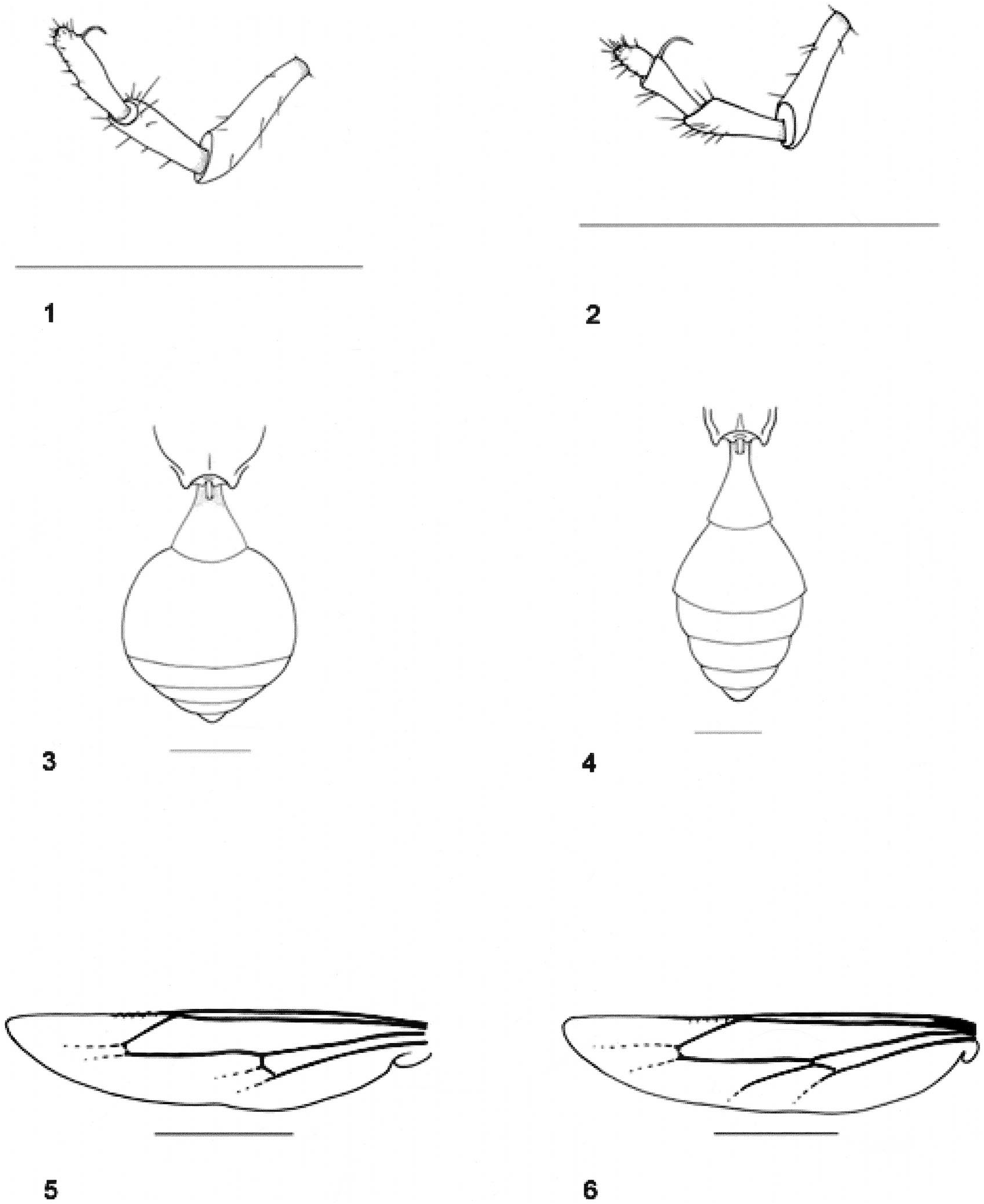Figs. 1–6. Neotropical Polistinae. 1–2. Labial palpus. 1. Chartergellus nigerrimus Richards. 2. Pseudopolybia compressa (de Saussure). 3–4. Metasoma in dorsal view. 3. Marimbonda albogrisea Richards. 4. Leipomeles dorsata (Fabricius). 5–6. Hindwing. 5. Marimbonda albogrisea Richards. 6. Leipomeles dorsata (Fabricius). All scale bars are 1.0 mm.