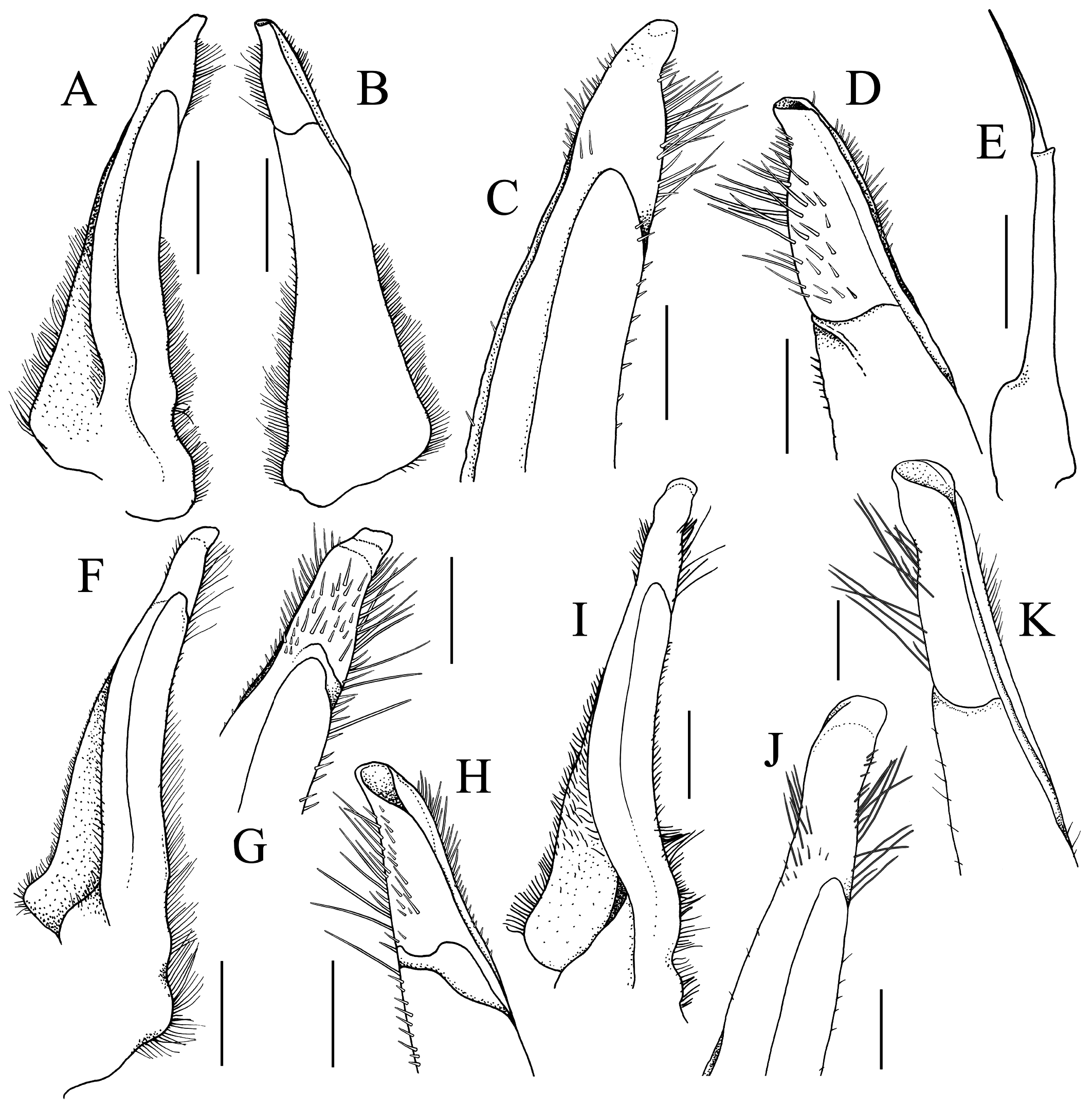 Fig. 7. A–E, Sundathelphusa brachyphallus, new species, holotype male (27.1 × 22.0 mm) (MZB Cru 4396); Kalimantan Tengah, Indonesia; F–H, Sundathelphusa tenebrosa Holthuis, 1979, holotype male (23.5 × 19.1 mm) (NHM 1979.135), Gunung Mulu National Park, Sarawak; I–K, Sundathelphusa aspera Ng & Stuebing, 1989, male (32.3 × 25.4 mm) (ZRC 2014.845), Temburong, Brunei. A–D, I–K, left G1; E, left G2; F–H, right G1 (laterally inverted to allow for better comparisons; left G1 missing). A, F, I, left G1 (ventral view); B, left G1 (dorsal view); C, G, J, distal part of left G1 (ventral view); D, H, K, distal part of left G1 (dorsal view); E, left G2. Scale bars: A, B, E = 1.0 mm; C, D = 0.5 mm.
