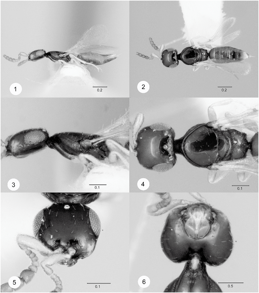 Figs. 1–6. Janzenella innupta, n. gen. et sp., paratype female. (OSUC 167372); 1, Lateral habitus. 2, Dorsal habitus. 3, Head and mesosoma, lateral view. 4, Head and mesosoma, dorsal view. 5, Head, frontal view. 6, Head, posterior view. Scale bars in millimeters.