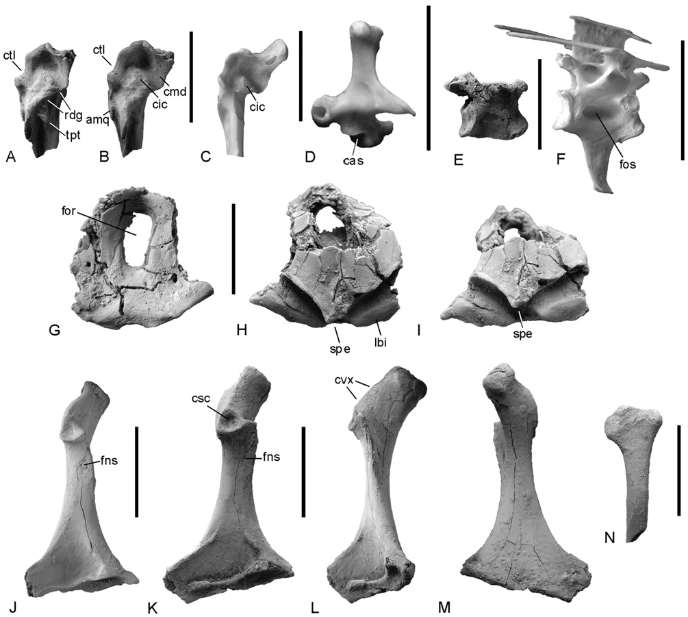 Figure 1. Selected skeletal elements of Rupelornis definitus in comparison to extant Procellariiformes. A, B, R. definitus, proximal end of right mandible (IRSNB Av 109a) in dorsal (A) and mediodorsal (B) view. C, proximal mandible of Puffinus huttoni (Procellariidae). D, right quadrate of P. huttoni. E, R. definitus, thoracic vertebra (IRSNB Av 109b). F, thoracic vertebra of P. huttoni. G-I, R. definitus, sternum (IRSNB Av 104a) in ventral (G), dorsal (H), and craniodorsal (I) views. J, R. definitus, left coracoid (IRSNB Av 107b) in dorsal view. K–M, R. definitus, left coracoid (IRSNB Av 112a) in dorsal (K), medial (L), and ventral (M) views. N, R. definitus, left scapula (IRSNB Av 102f) in lateral view. Abbreviations: amq, attachment area of musculus adductor mandibulae ossis quadrati; cas, rostrally projecting, concave articular surface of condylus medialis; cic, crista intercotylaris; cmd, cotyla medialis; csc, cotyla scapularis; ctl, cotyla lateralis; cvx, convex dorsal surface of extremitas omalis, between cotyla scapularis and tip of the processus acrocoracoideus; fns, foramen nervi supracoracoidei; for, large foramen in cranial portion of ventral surface of corpus sterni; fos, fossa on corpus of thoracic vertebra; lbi, labrum internum; rdg, ridge between the proximal end of cotyla medialis and tuberculum pseudotemporale; spe, spina externa; tpt, tuberculum pseudotemporale. Fossil bones are coated with ammonium chloride. Scale bars = 10 mm.