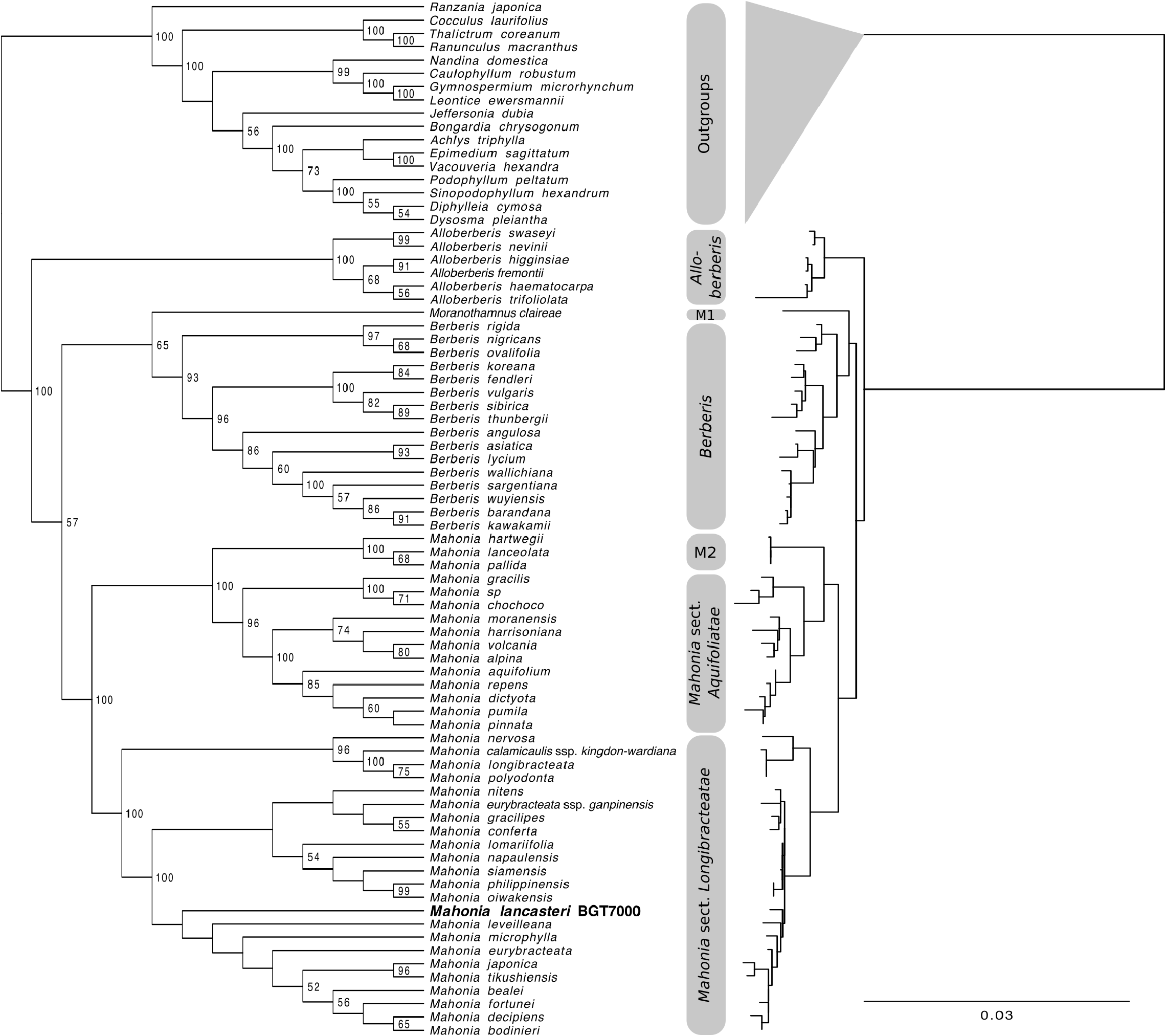 FIGURE 2. Maximum likelihood cladogram (left) and phylogram (right) depicting the relationship of Mahonia lancasteri with related Mahonia species and Berberidaceae from Yu et al. (2017), based on nuclear ITS, accD, ndhF, rbcL and psbA-trnH. Phylogenetic position of the M. lancasteri sequence (holotype BGT7000) is highlighted in bold. Bootstrap values indicated above nodes, values below 50 not shown. M1: Moranothamnus Yu & Chung (2017). M2: Mahonia sect. Paniculatae Fedde (1901). For readability, outgroups branches are collapsed in the phylogram.
