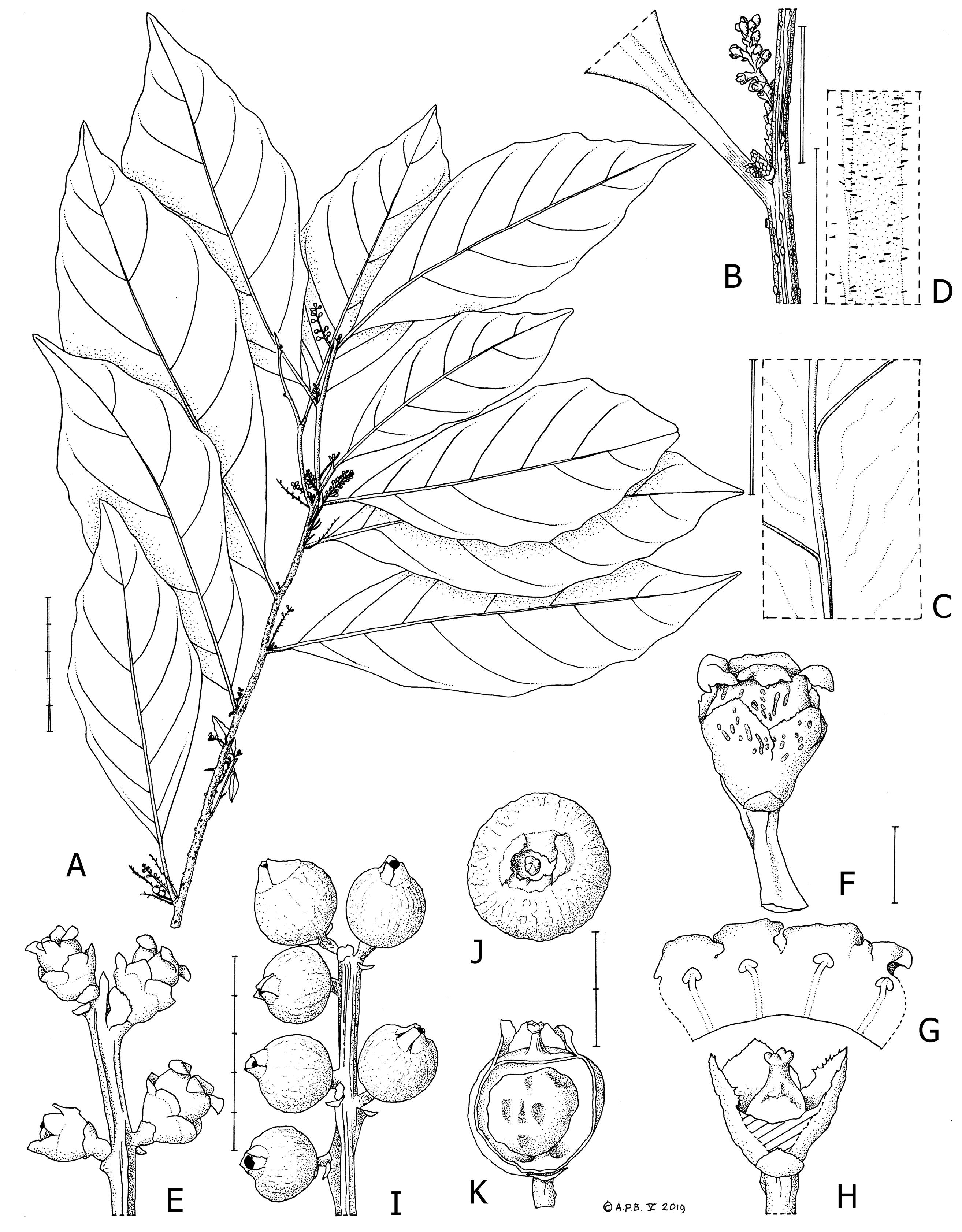 FIGURE 2. Maesa aurulenta Sumanon & Utteridge. A habit; B node with petiole and inflorescences; C abaxial surface of leaf; D hairs on abaxial midrib; E distal part of inflorescence; F pistillate flower, hydrated; G corolla from F, opened flat; H flower after removal of corolla and calyx lobe; I distal part of infructescence; J fruit apex; K fruit, lateral view after removal of one calyx lobe and part of proximal wall. A–D from Schodde 5647 (K) and E–K Kanis 1242 (K). Scale bars: single bar = 1 mm, graduated single bar = 5 mm (E and I) and 2 mm (J and K), double bar = 1 cm, graduated double bar = 5 cm. Illustration by Andrew Brown.