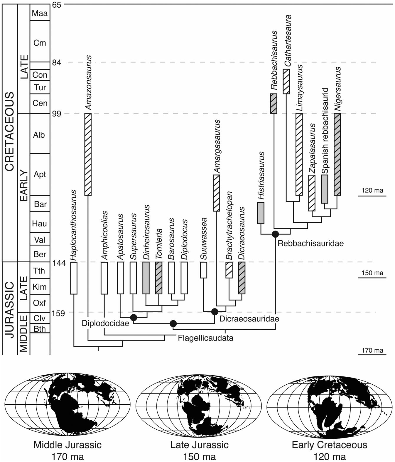 Figure 9. Calibrated phylogeny of diplodocoid sauropods. Cross-hatched bars indicate Gondwanan affinities, hollow bars indicate Laurasian. Grey bars indicate 'old world' (Europe/Africa), white bars indicate 'new world' (North/South America). Temporal boundaries based on Gradstein, Ogg & Smith (2004). Palaeogeographical reconstructions below phylogeny illustrate continental connectivity at three key time intervals: the Middle Jurassic (170 Mya), likely time of origin for Diplodocoidea; the Late Jurassic (150 Mya), interval of greatest diversity within Flagellicaudata; and Early Cretaceous (120 Mya), interval of greatest rebbachisaurid diversity. Reconstructions based on Blakey (2006).