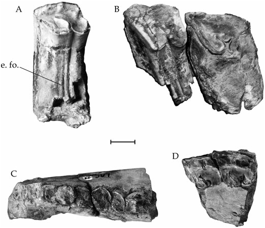 Figure 18. Trachytherus spegazzinianus from Lacayani. A, left M1, LAC 14. B, right (reversed) M2–3, MNHN-BOL-V 010725. C, right dentary with p3–4, m1 (or p4, m1–2), LAC 19. D, left maxillary with dP3–4, LAC 4. Scale bar = 1 cm.