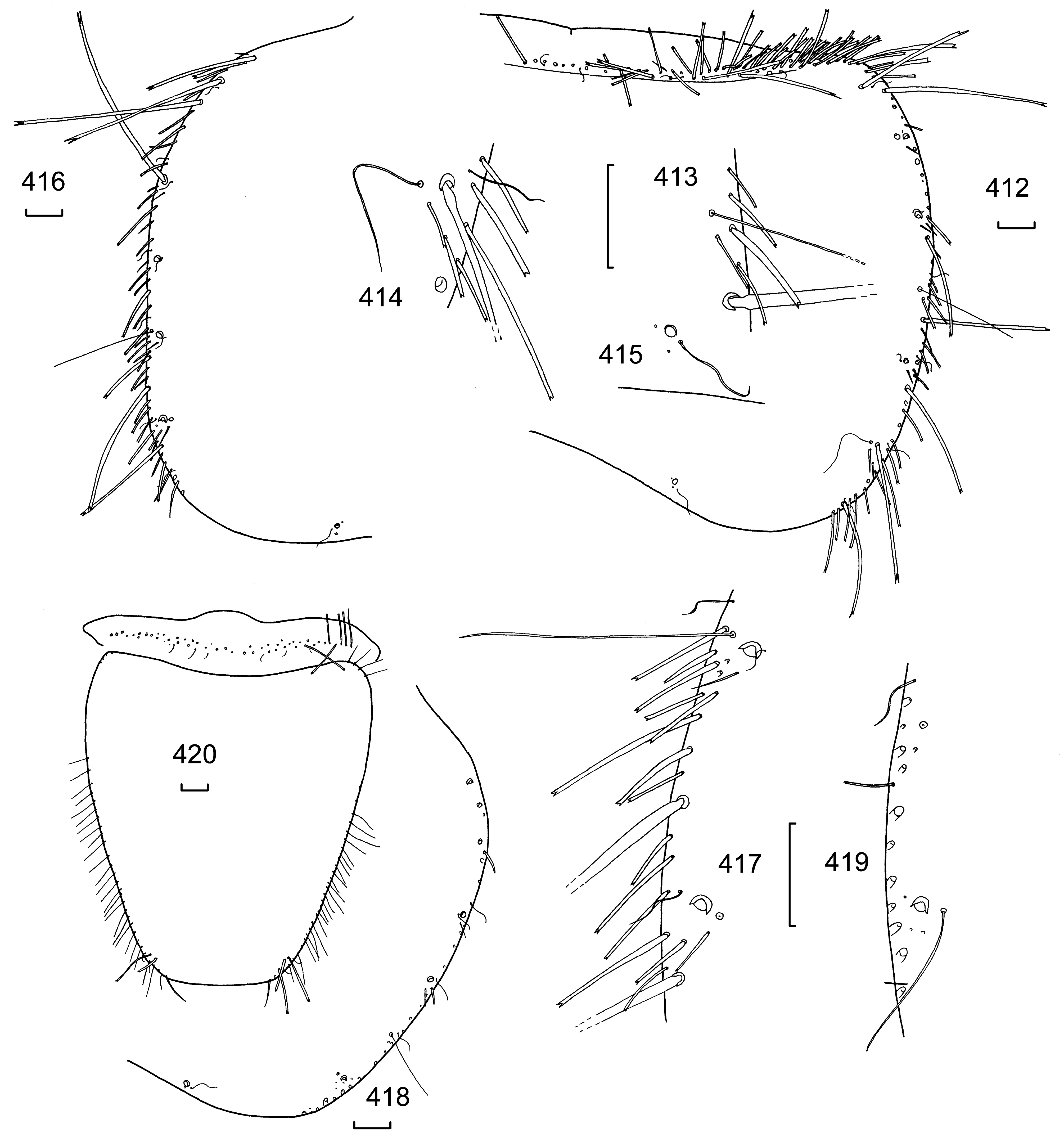 FIGURES 412–420. Visma xanthorrhoea n. sp. holotype ♀ 412. Pronotum, right half. 413. Idem, right anterior trichobothrial area. 414. Idem, right posterior trichobothrial area. 415. Idem, right posterior comb. 416. Mesonotum, left margin. 417. Idem, trichobothrial areas. 418. Metanotum, right margin. 419. Idem, trichobothrial areas of left margin. 420. Presternum, and prothoracic sternum. Scales: 0.1 mm.