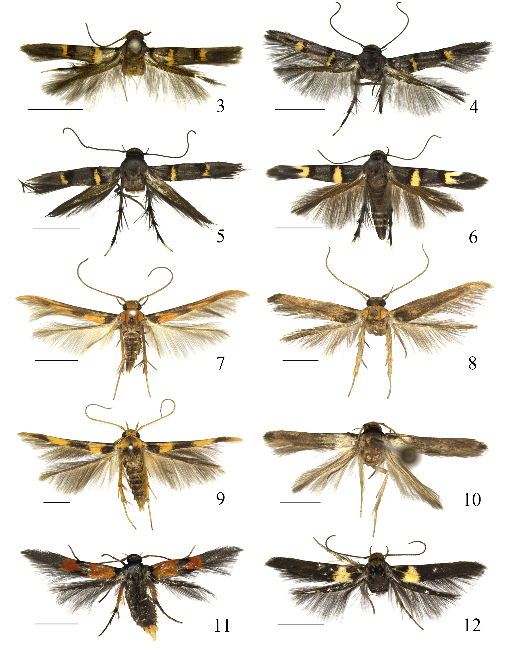 FIGURES 3‒12. Adults of Stathmopoda spp. 3, S. apicihamata sp. nov., holotype, ♂; 4, S. culcitella, ♂; 5, S. trigonia sp. nov., holotype, ♂; 6, S. xanthomochla, ♂; 7, S. aprica, ♂; 8, S. similignominiosa sp. nov., holotype, ♂; 9, S. sufusciumeraris sp. nov., paratype, ♂; 10, S. balanarcha, ♂; 11, S. ferrorufa sp. nov., paratype, ♀; 12, S. jinxiuensis sp. nov., holotype, ♂. Scales = 2.0 mm.