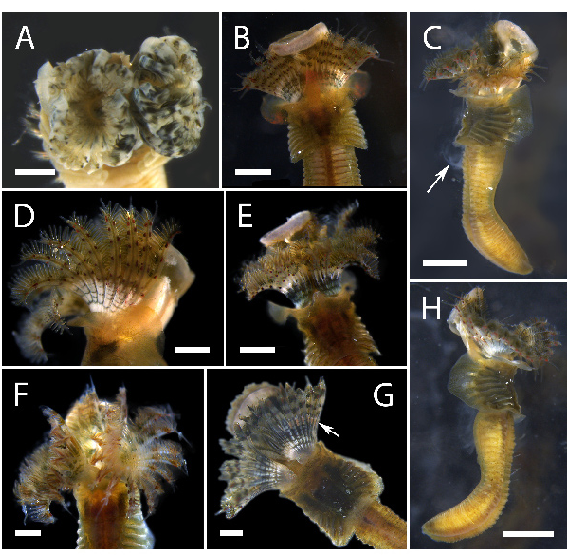 FIGURE 3. Radiolar crown in Spirobranchus bakau sp. nov. specimens. A—Top view of radiolar crown in paratype (ZRC. ANN.0482), showing circular arrangement of radioles; B, D—Radiolar crown with alternating black and cream-coloured bands at the base. The translucent, free ends of the radioles take on the colouration of underlying golden-brown pinnules. Red pigmented spots are mostly arranged in pairs on each radiole; C, H—Lateral views of complete holotype of S. bakau sp. nov. (ZRC.ANN.0480). Image was taken prior to excision of posterior abdominal segments for molecular studies. Evidence of sperm release in C (white arrow), indicating that the specimen is a male; E—Greyish bands alternating with black bands at base of radioles; F—Pinnules near tips are of brownish colouration; G—Distal end of radiolar base in paratype (ZRC.ANN.0481) with peach colouration (white arrow), which extends into inter-radiolar membrane. Scale bars—A–B, D–G: 0.5 mm, C, H: 1 mm.