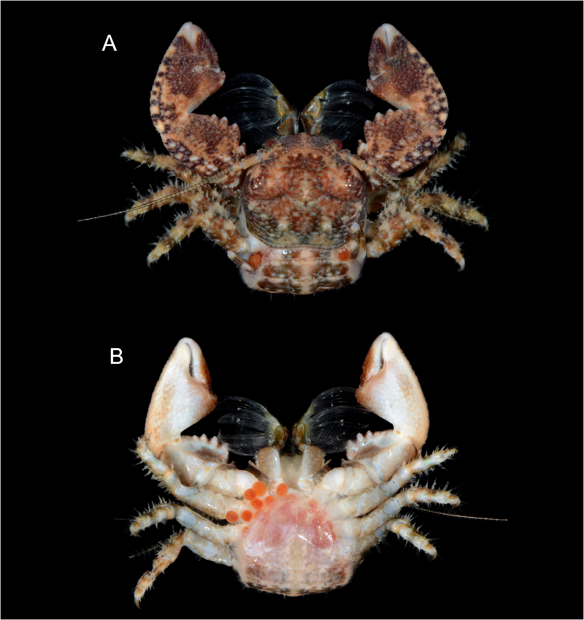 FIGURE 57. Petrolisthes hians Nobili, 1901: A, B, ovigerous female (cl 5.0 mm, cw 5.1 mm) from Río Mar, Panama (MZUSP 33476), dorsal (A) and ventral (B) views [photographs by AA].