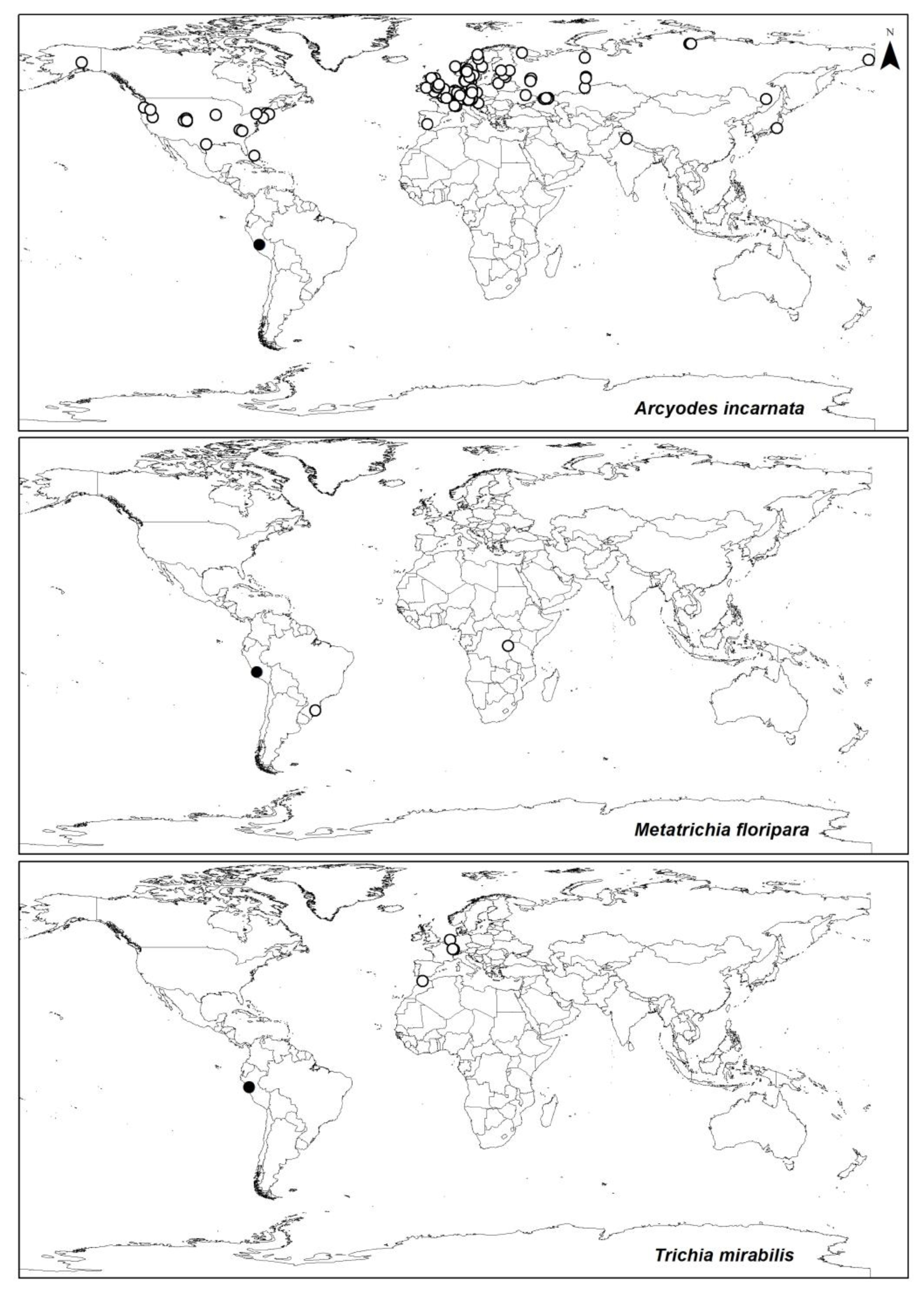 FIGURE 4. New records of Myxomycetes contributed in this work. (○) Previous distribution of the species, (●) new records.