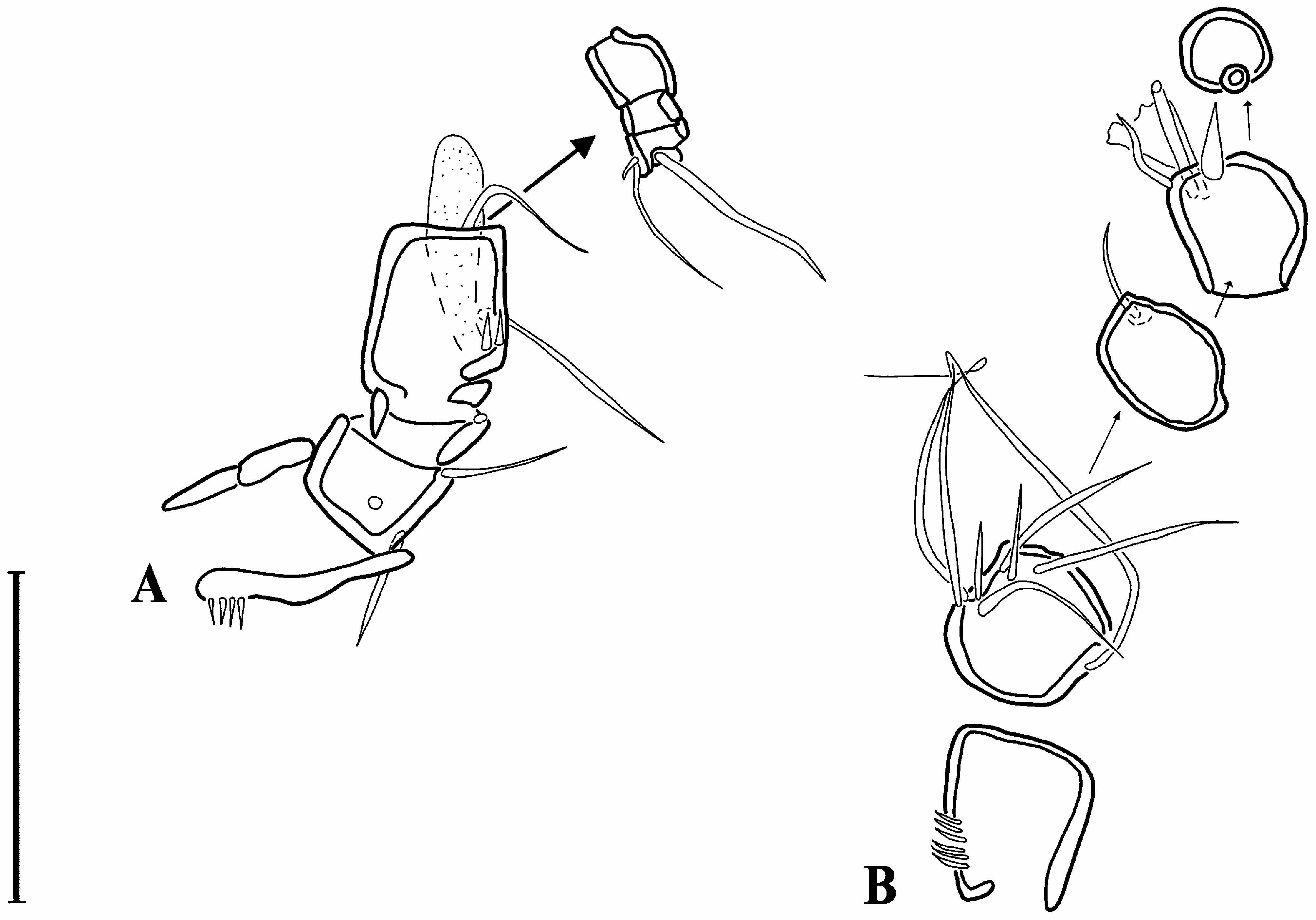 FIGURE 23. Emertonia hessleri sp. nov. Male (paratype 3). A, right antennule, ventral view; B, left antennule (not all segments illustrated). Scale bar = 0.02 mm.