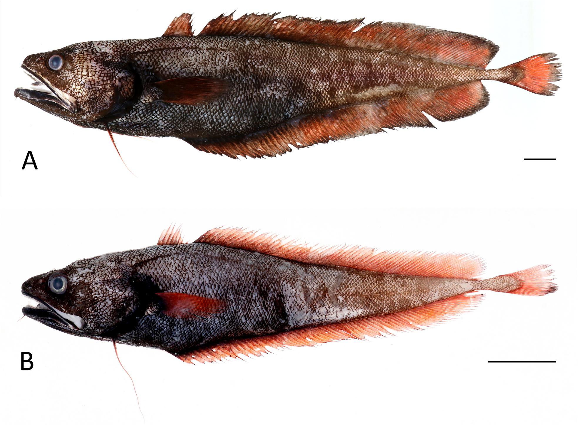 FIGURE 1. Fresh coloration of Physiculus megastomus sp. nov. A. Holotype, NMMB-P35678, 307.2 mm SL, picture inverted from the right side of body. B. Paratype, NMMB-P35679, 143.6 mm SL. Scale bar = 2 cm.