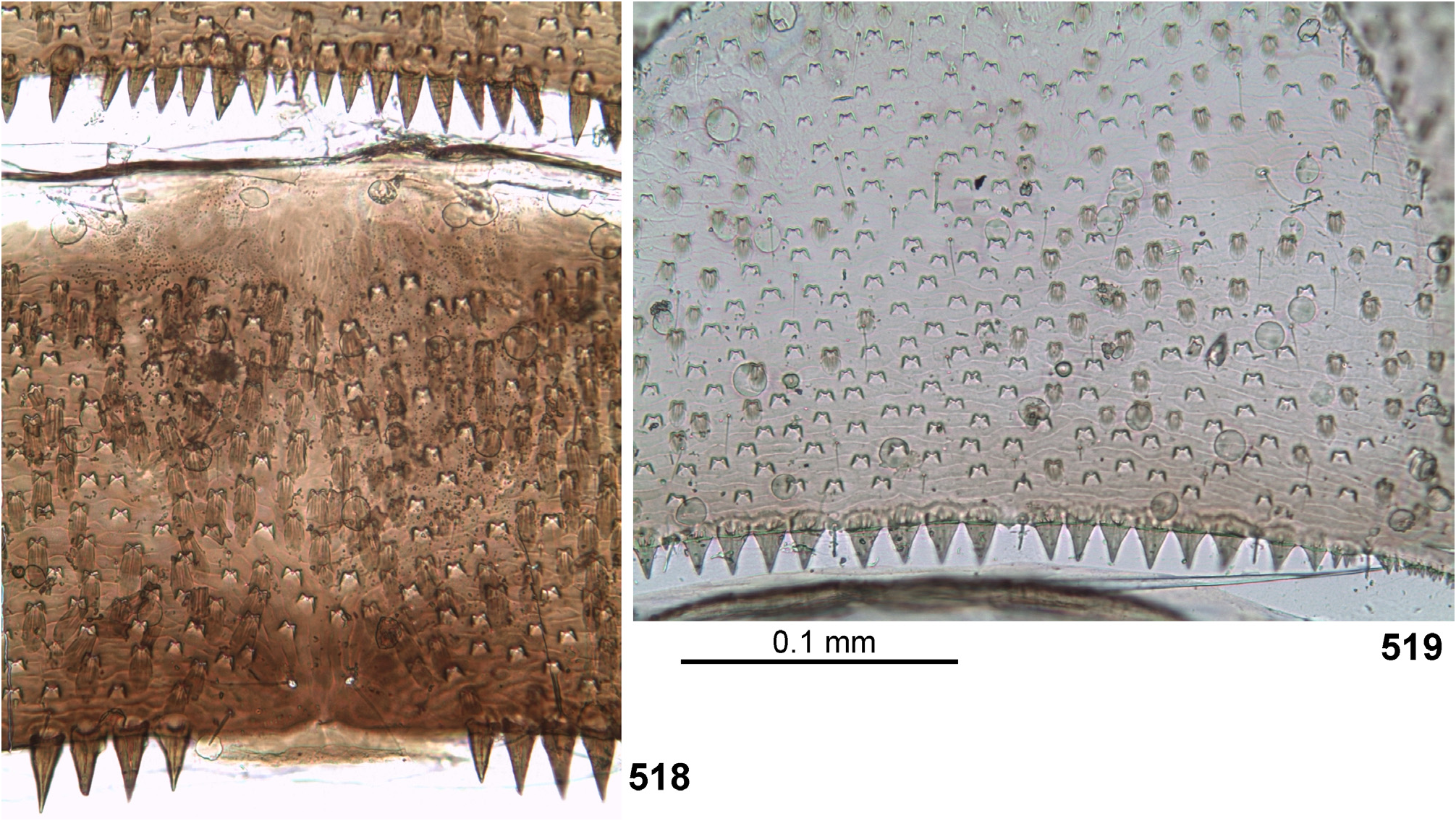 FIGURES 518–519. Centroptella (Chopralla) ghatensis sp. n., exuviae of larval abdomen. 518, tergum IX; 519, sternum VII.